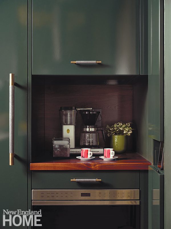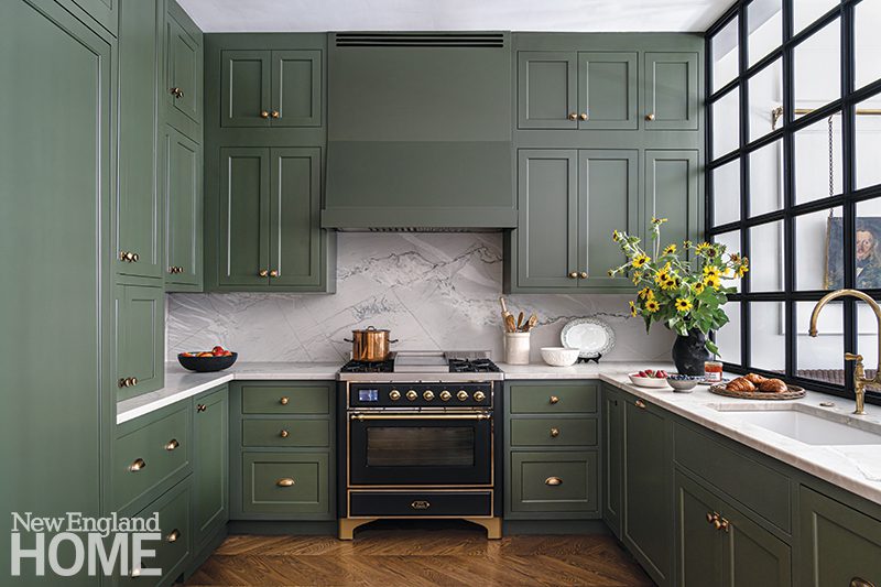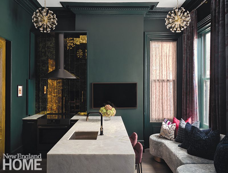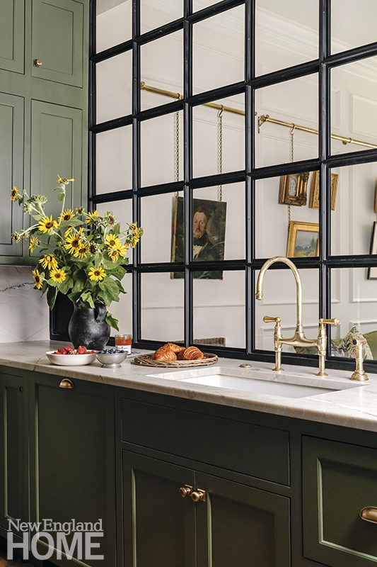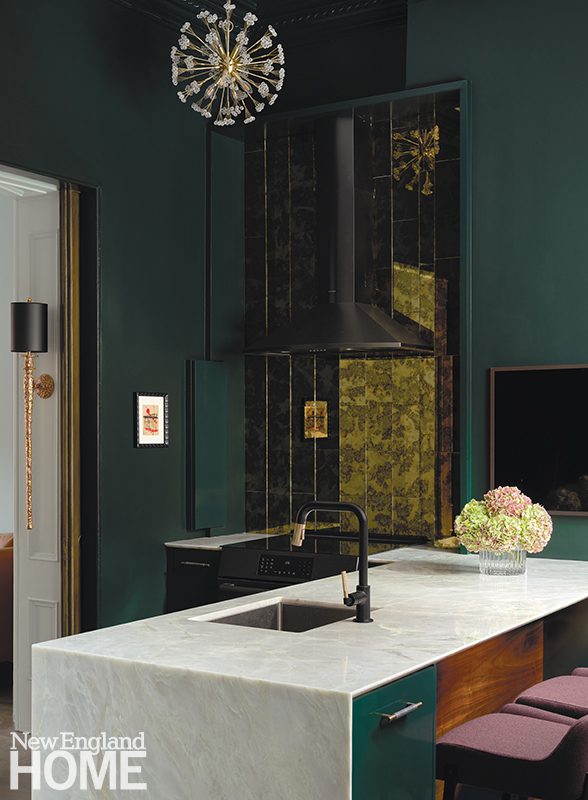 When designer Josh Linder of Evolve Residential was presented with a parlor-level pied-à-terre in an 1850s townhouse in Boston’s South End, he chose to lean into a more contemporary kitchen that wouldn’t compete with the historic shell. “The adjacent living room was intact, but the rear had been chopped up into a few different spaces with a narrow kitchen and a loft above it,” recalls Linder. “We wanted to reestablish these two grand rooms and have each space sing on its own.” To this point, the deep green kitchen serves as a bold counterpoint to the light, airy living room. “The main focus was downplaying the sense of a traditional kitchen to allow the space to feel as open as possible,” continues Linder. “The lack of upper cabinetry helps a great deal. Instead, we were able to tuck some storage into the thickness of the walls.” Slab-front cabinetry, a functional peninsula with a waterfall edge, and a mirrored backsplash lend a contemporary flair to the space.