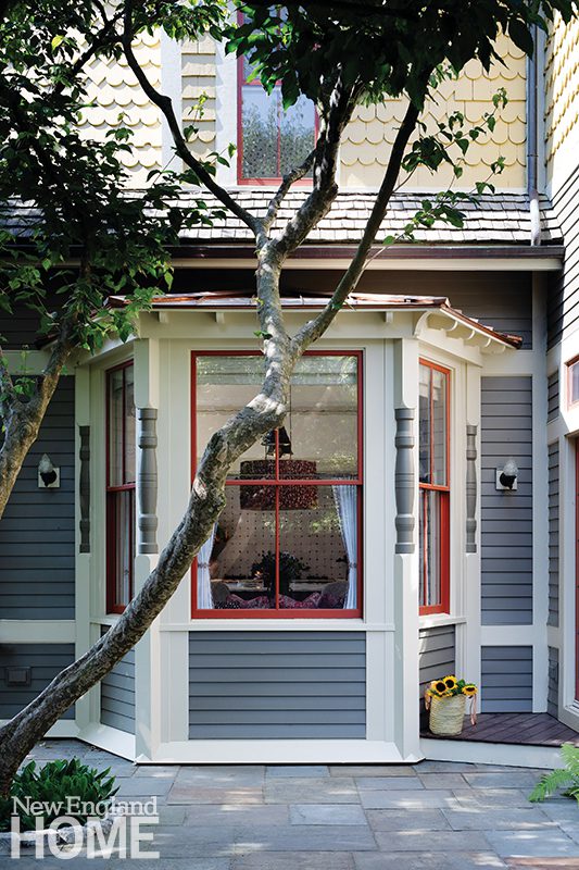 The team worked together to carry out several historic-inspired details, such as the corbels that set off both the range niche and the breakfast nook. “The corbels are replicas of originals seen throughout the rest of the house,” notes Kevin Cradock. “We also installed wood corner beading, which is more traditional than plaster, and restoration-glass windows. The goal was for everything to be as authentic as possible.”