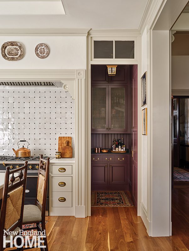 “The clients are interested in historical architecture and wanted a style that’s in line with the house,” says architect J.B. Clancy of ART Architects, who worked alongside Katie Rosenfeld & Co. and Kevin Cradock Builders to realize the English-inspired kitchen. The team reworked the layout to include a moody aubergine pantry, a bleached-walnut worktable, a tiled niche for the Lacanche range, and a breakfast nook.