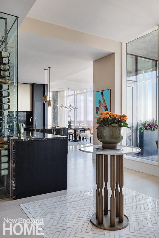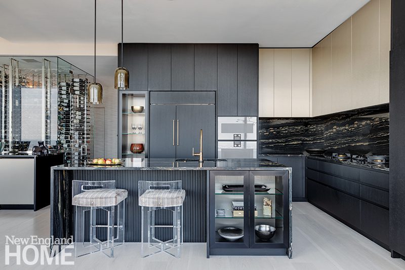 When a couple purchased this unit in Boston’s Millennium Tower several years ago, renovating the kitchen wasn’t a top priority. “The original kitchen was more traditional than what the clients had envisioned, but they hesitated to rip it out because it was very well done,” explains designer Carolyn Thayer, who decorated the residence when the clients first moved in. However, Thayer recently got the call that it was finally time to address the space. “The owners like to cook and entertain, but it was really the overall aesthetic that drove this renovation,” says Thayer. “They asked for a kitchen that feels updated and cool. There are two entrances to the unit, one being near the kitchen, so that space really grabs the eye upon entry.” Thayer concocted a luxurious scheme that includes an interesting mix of both dark-stained wood and metal cabinetry, glass displays, tambour detailing, and dramatic granite countertops. “Sometimes kitchens can feel like a bunch of boxes, but you don’t get that feeling here,” says the designer. “This is much more integrated.”