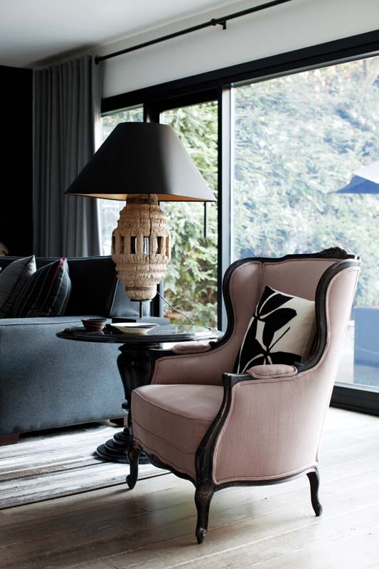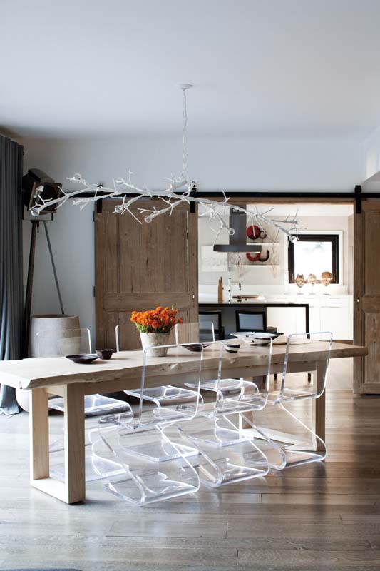 Known for her fearless contrasts, Maestroni partners the living room’s matte black walls with a snowy Venetian-plastered hearth. Plexiglass chairs team with a rustic dining table. “The see-through chairs allow you to look at the beautiful wood,” she says.