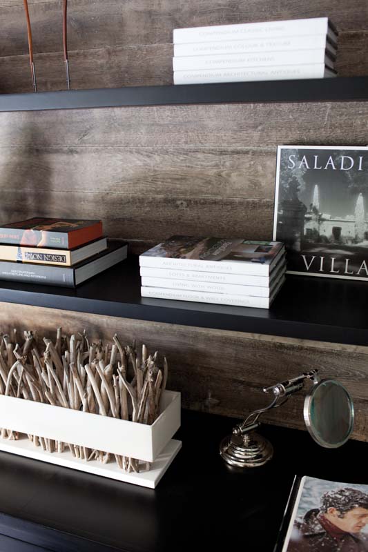 The existing garage was repurposed as the new kitchen, increasing the square footage and boosting the livability factor. Dazzling white Corian counters and gleaming Miele appliances—hidden within a system of custom-made floor-to-ceiling wooden doors—are in keeping with the slick scheme. But even here, objets d’art find their place. Most intriguing is a cache of decorative treasures perched on pristine shelves mounted with rustic branch-like brackets.
