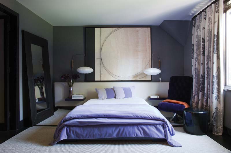 Her knack for choosing materials is evident again in the master suite. Gray flannel reveals its underlying sensuousness, wrapping her bedroom walls in a luxurious cocoon. Purple—the color of kings—is the designer’s favorite. Married with gray, shots of the hue enliven the space without disturbing its tranquility. At the bed’s head hangs a painting by Jean-Marc Louis. “I love interior design, yet art has always been my main passion,” the many-faceted Maestroni says. “Louis’s work is simple and unique.”