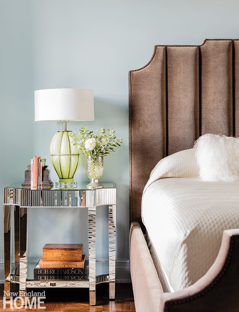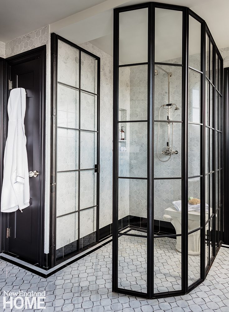 Using a saturated palette throughout, Hughes went bold with blues in the living spaces and lit up the walk-in closet with a glowing Hermès orange—a nod to the French brand the couple appreciates. Key materials such as nubby raw linen, mohair, and velvet further dial in that casual-yet-sophisticated feel, while black ironwork—a Parisian signature—adorns the primary bathroom’s custom curving shower, one of many engineering feats the team tackled. Given the 1940s building was constructed after Boston’s Cocoanut Grove fire, the deadliest nightclub fire in history, ten-inch-thick concrete walls offer a fireproof, soundproof shell that also made changing anything and everything très difficult.