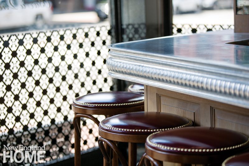Meanwhile, the bar became a showpiece just to the left of the entrance. Millworker Nick Doriss used French oak to fabricate the base of the bar, the shelving that holds spirits and glassware, and the decorative hand-carved panels that border the ceiling. The stools sit on classic black-and-white Parisian hex tile that delineates the bar and entrance from the dining room (a large “A” fabricated into the floor tile alerts regulars that they’re home). Woods insisted that the new bar top be similar to the old one. While the original was zinc, the designers opted for poured pewter, which has the same look but is a bit brighter. Other classics on that must-stay-but-update list? The signature burgundy banquettes and the globe-style lighting. “Some things that really resonate with people had to stay,” the owner says. “They carry this authenticity and grit that people are looking for.”
