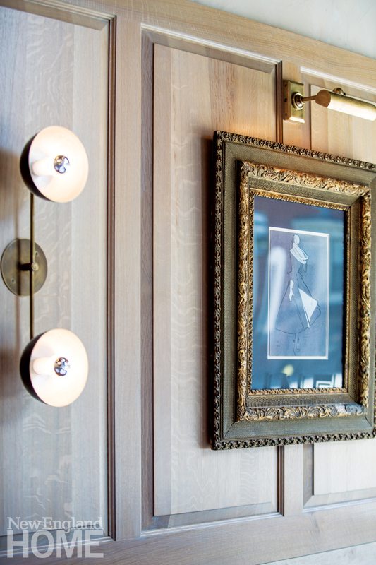With an eye to freshening up the familiar, Hark and Osborne designed most of the lighting and sourced it via the Manhattan-based O’Lampia. Oversized globes dangle above the bar, and large five-orb chandeliers cast a warm glow on the dining room. Forgoing track lighting, the designers had O’Lampia craft brass mono-point lights, lending an older, more authentic look. For wall sconces, they went French retro: chic blackened-brass fixtures with an accent in the center of silver leaf and brass.