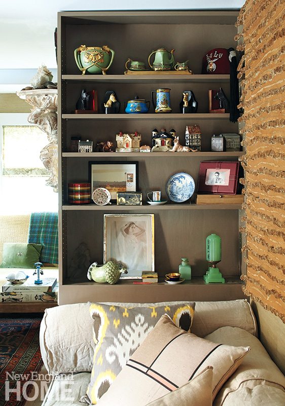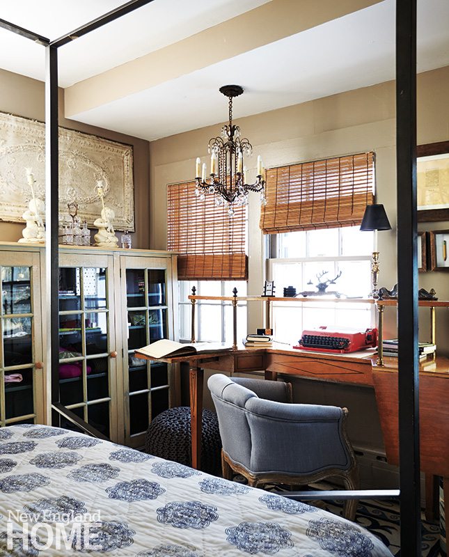 The building’s floor plan is U-shaped, and the front door opens directly onto the living room. Bee maximized the space by designing a daybed/sofa with bookshelves on both sides. The thoughtful placement of furnishings and treasured collectibles goes a long way toward making the cottage feel much more spacious than it is. “I love being eclectic, so I found lots of antique pieces that had storage and character,” he says. Inspired by the practical compactness of a ship’s cabin, he made room to store linens, pillows, and anything out-of-season inside cabinets, on shelves, and hidden under benches. “I made this house seem as large as my 7,000-square-foot house in Sharon,” he says.
