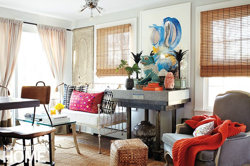 As a fiber artist (he owns a knitting bag company called Wooly Bully), Bee has a passion for textiles, and for brazenly mixing color, texture, and pattern. He let loose in the living room, where he used reclaimed wood to cover the fireplace wall. “My contractor said, ‘I take that stuff down, not put it up,’” he recalls. “I said, ‘Trust me.’”