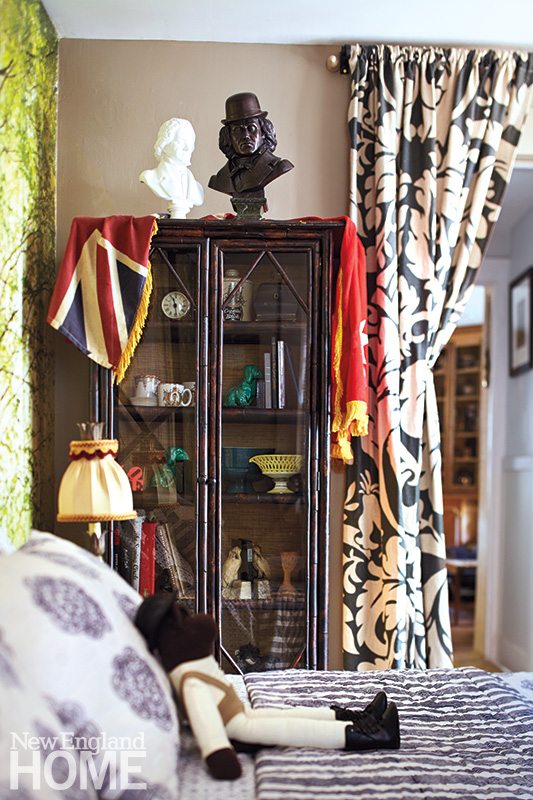 Crazy about the toile curtains that came with the house, he found some vintage hand-painted wallpaper to go with them, and yet another living room wall is covered with vintage silk grasscloth. “Everyone thought I was nuts, that the patterns would clash, but in fact they dance together in a surprising and joyful way,” he says.