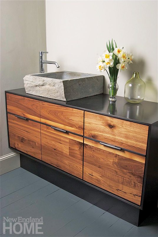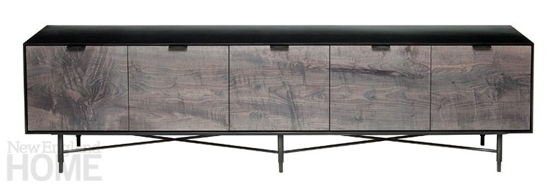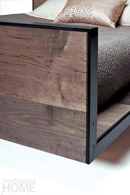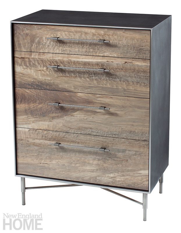 His work today is a distillation of that dichotomy he loves. The chest of drawers that nearly knocked me over has a simple metal frame of rolled steel, fabricated in his shop. The legs and pulls are shiny, the case burnished and sealed so that it looks like dark gray slate.