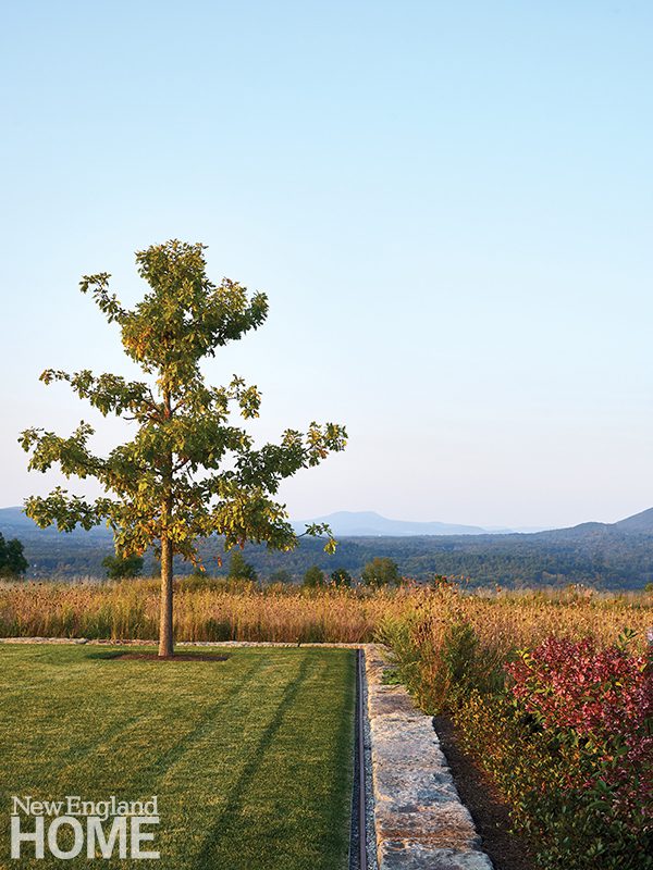 Granite pavers set into stone dust and populated with monolithic granite benches turn the home’s forecourt into a casual gathering space. A water feature consisting of a runnel with uplighting for an ethereal glow leads visitors past a grove of honey locusts to the front door. Energy-friendly Brombal windows from Italy allow views through the house to the mountains beyond.