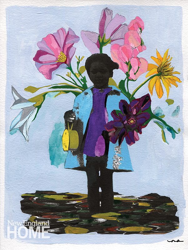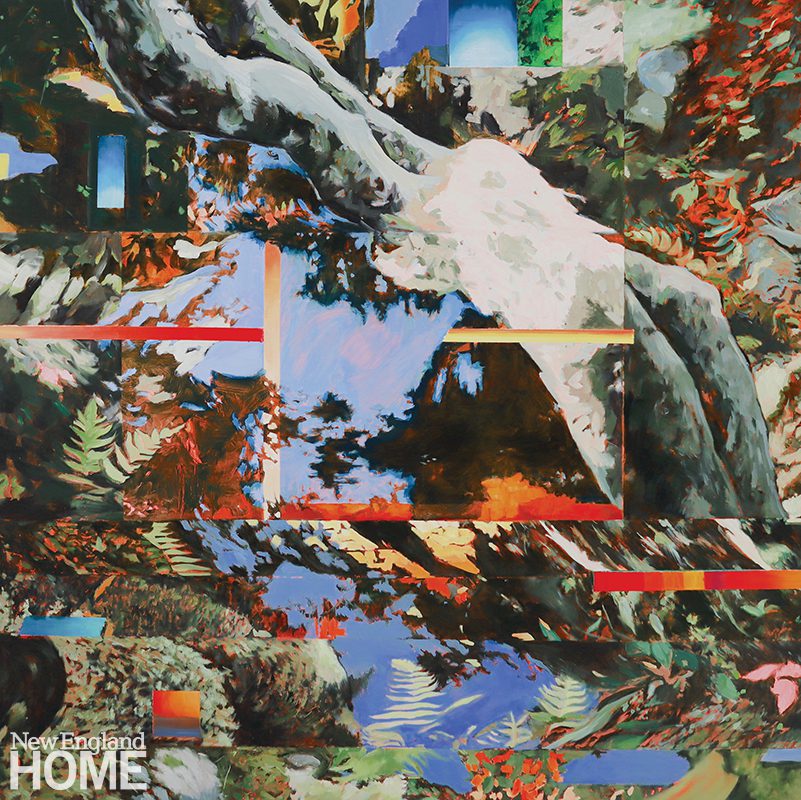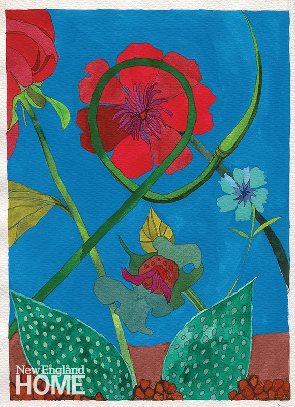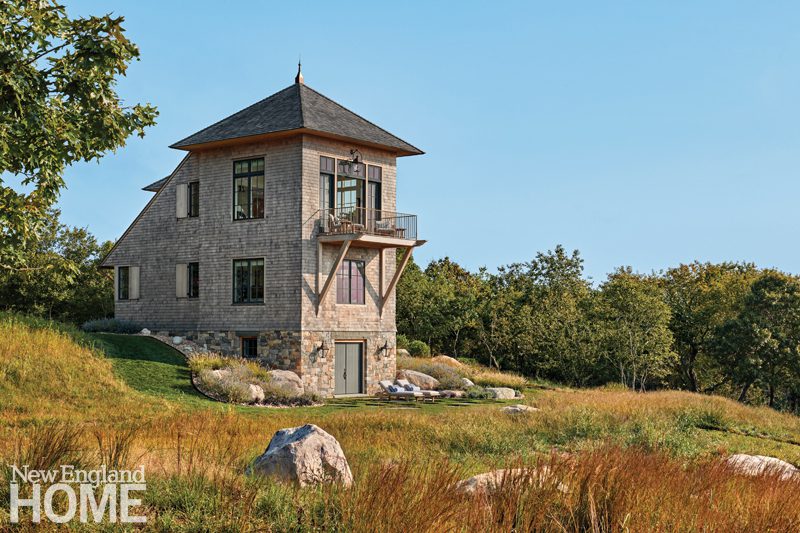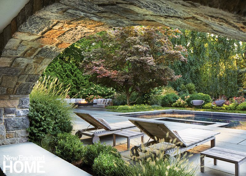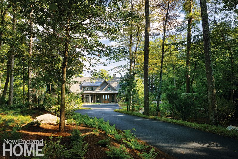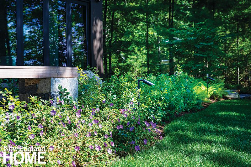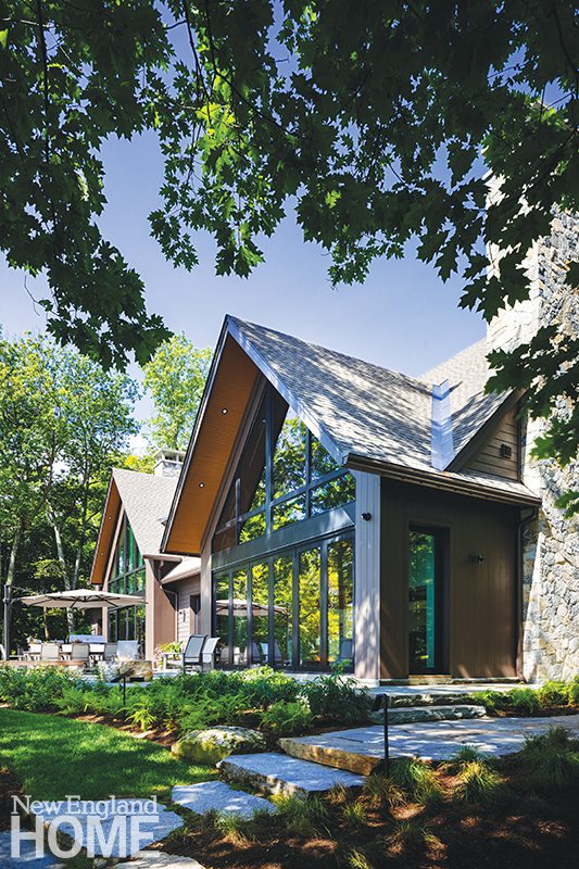 A permeable path leads to the window-lined pavilion joining the home’s two halves; a fieldstone wall divides the walkway from a rain garden fed by stormwater runoff.