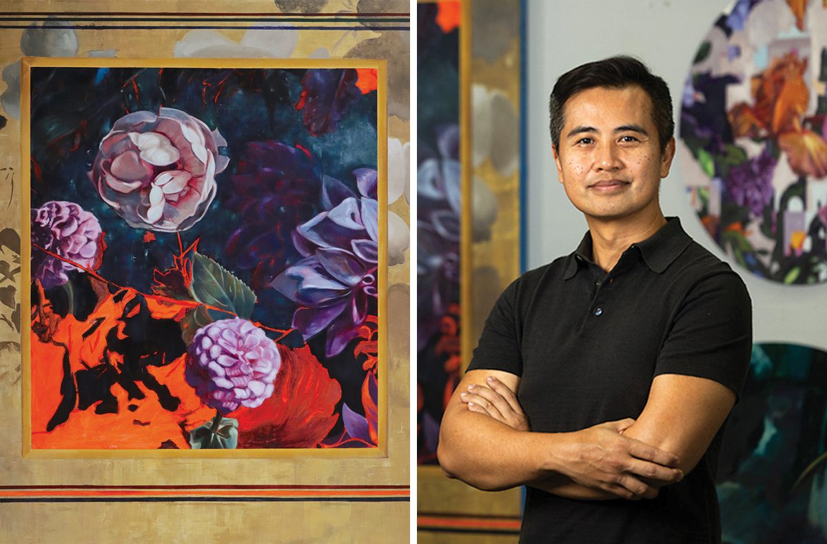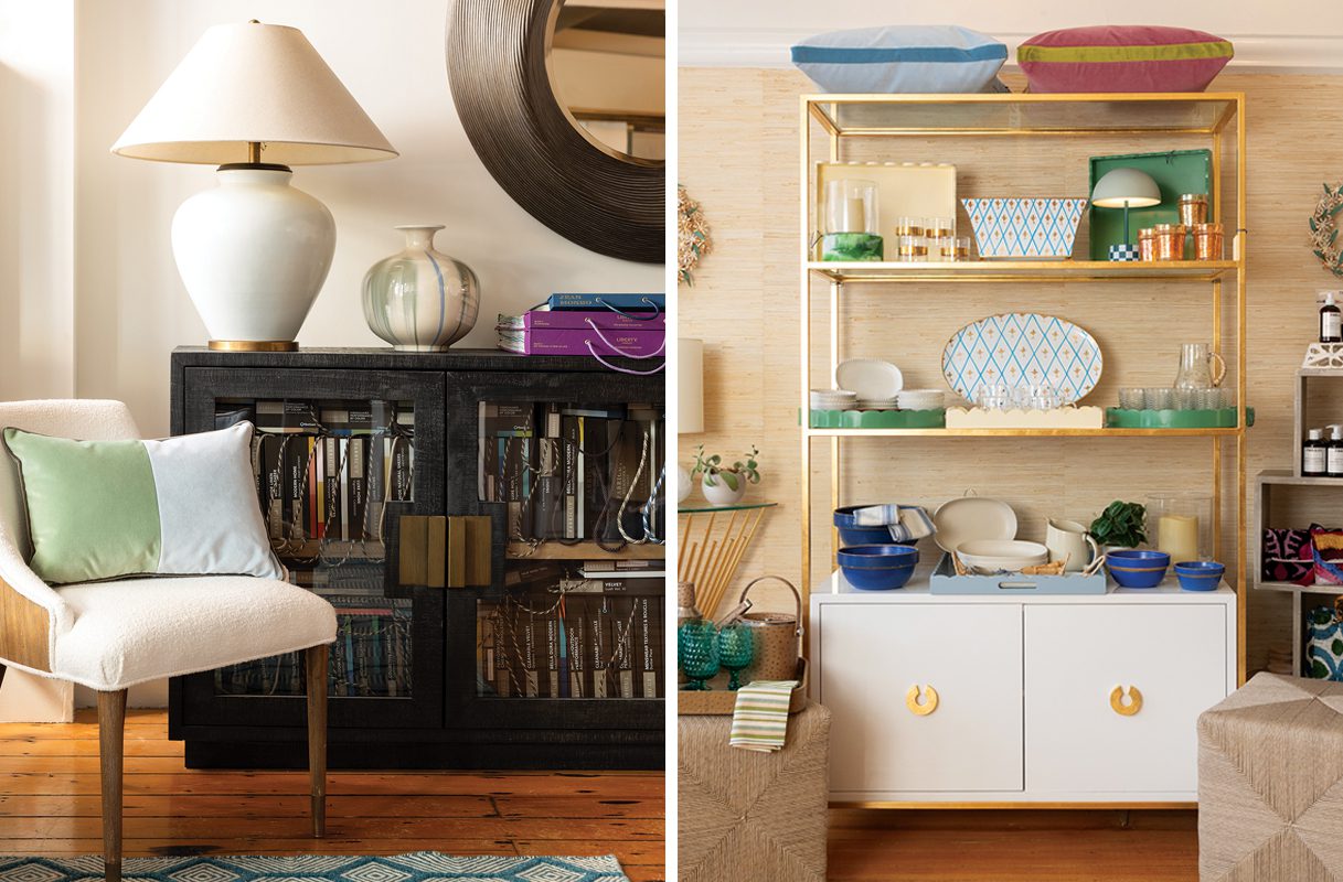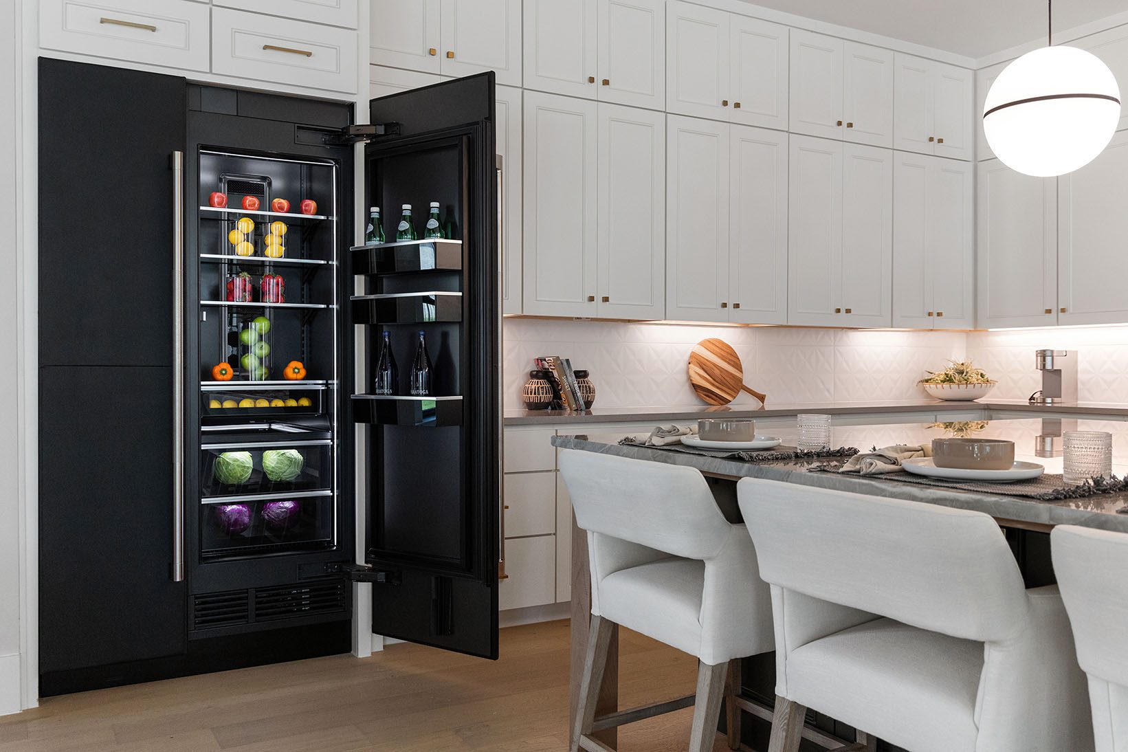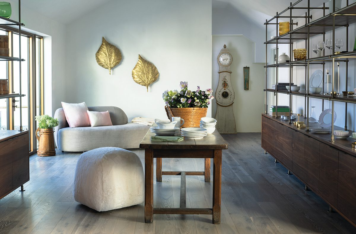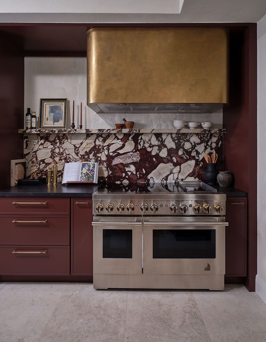 The kitchen cabinetry is traditional, but the room itself is unabashedly modern with a custom brass hood as a focal point. The island sink faces the light-filled living room. To the left, a wood-lined coffee bar can be concealed by pocket doors, much like the spice racks flanking the Lacanche range.