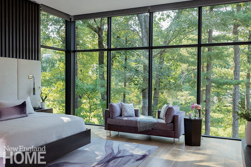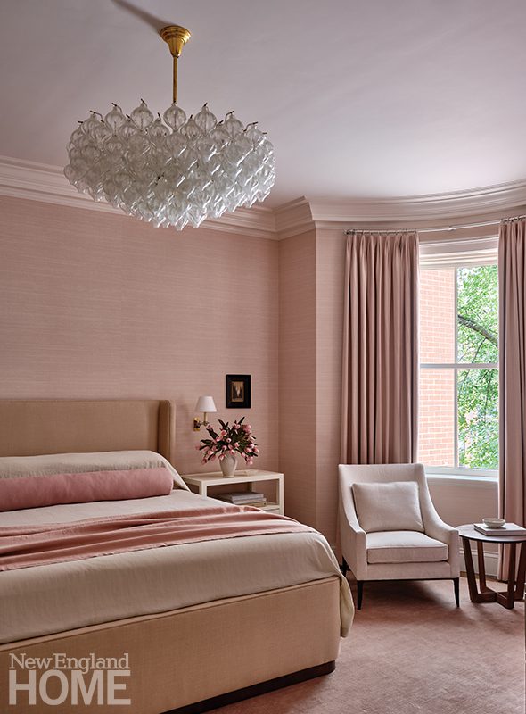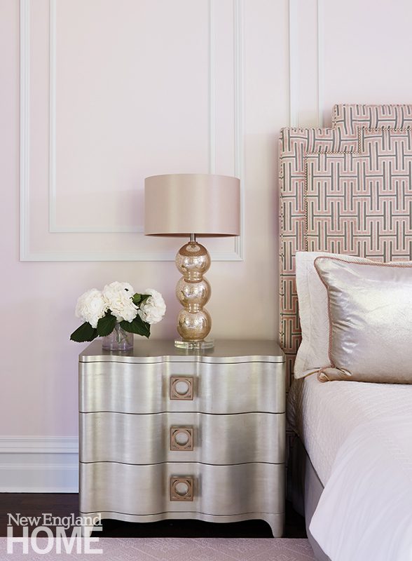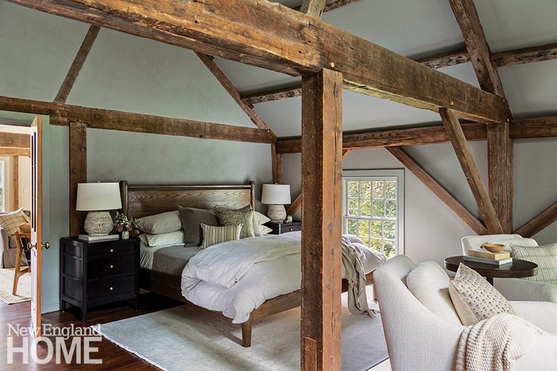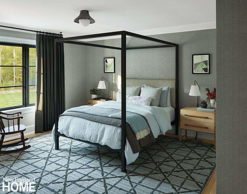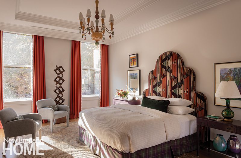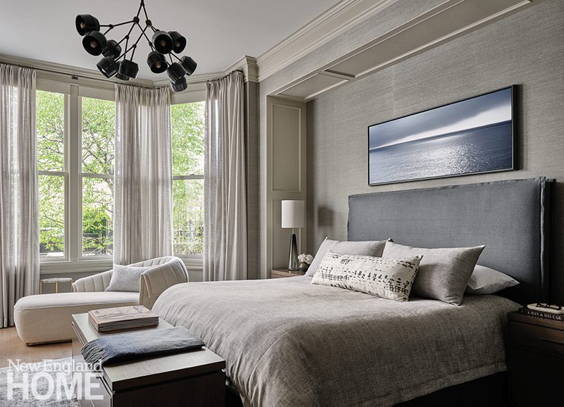 The primary bedroom, which is painted Benjamin Moore Fairview Taupe, has a custom upholstered bed from Liven UP Design in California and burlwood side tables from Made Goods.