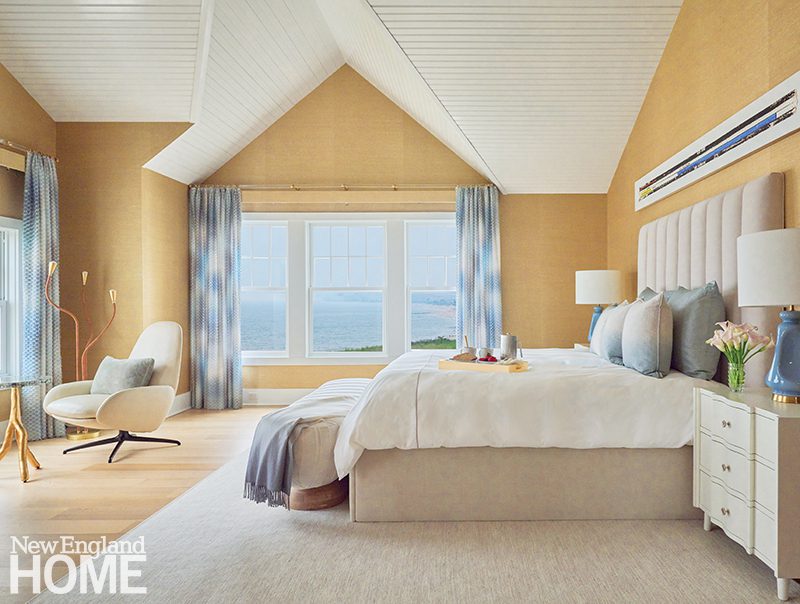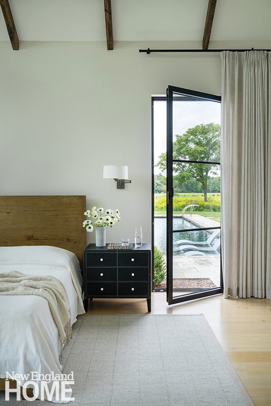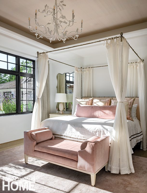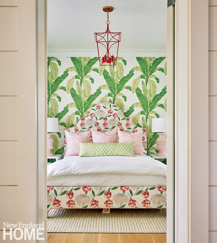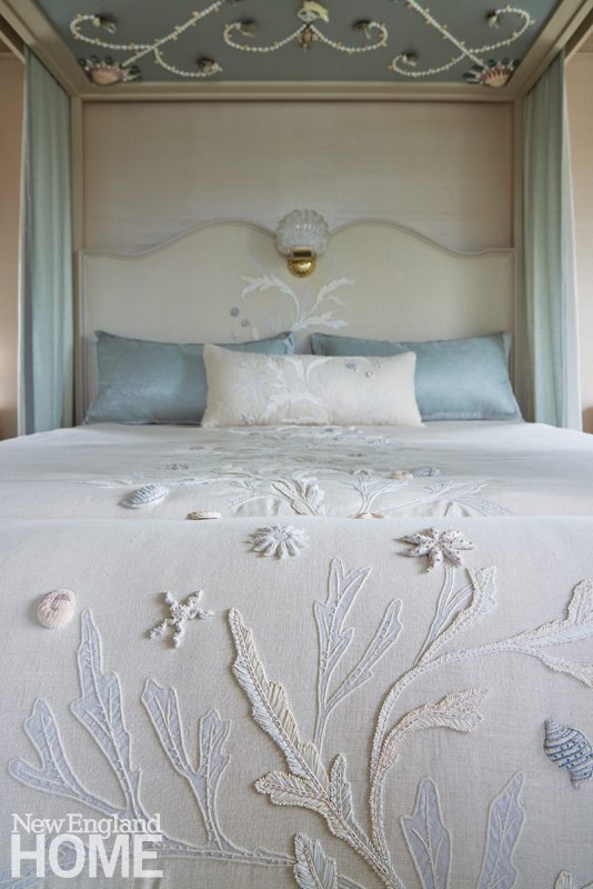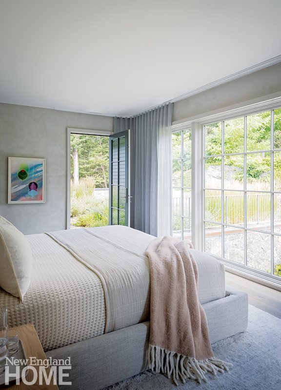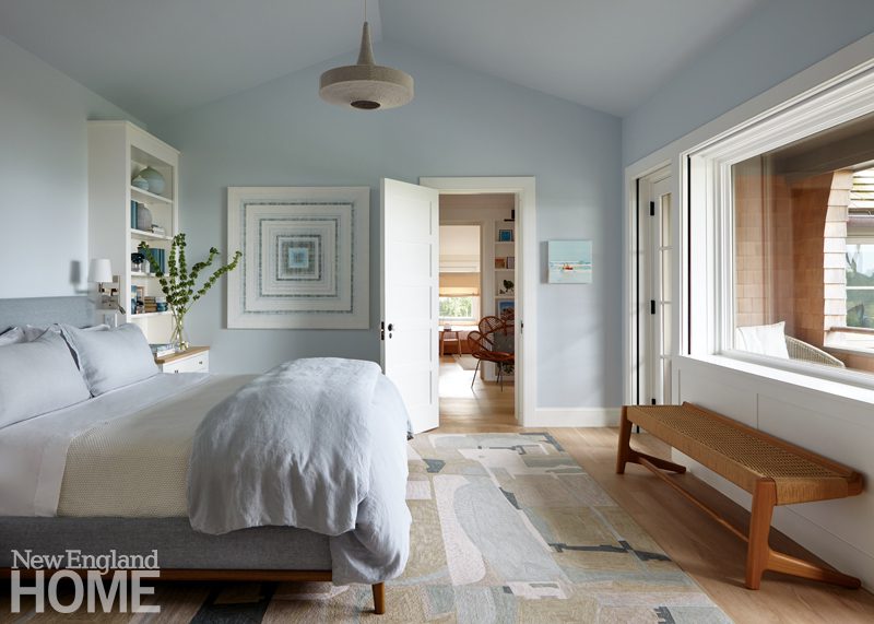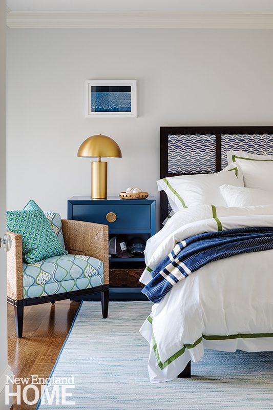 Duffy lets the natural world deliver the color in the main living areas, but she indulges her own favorite hues in the home’s four bedrooms, each with its own distinctive design. A Palecek chandelier cascades over an Oly Studio bed in this blue-tinged guest room, which has a bone-inlay nightstand and oversized shell sconces by Made Goods.