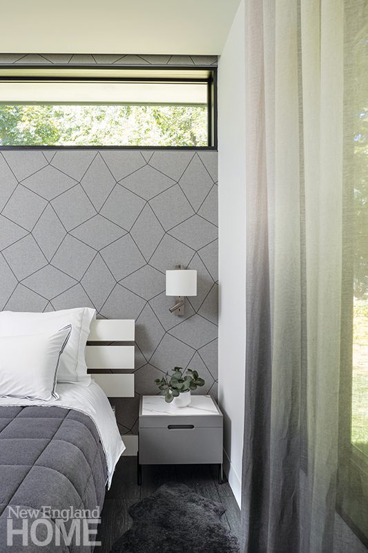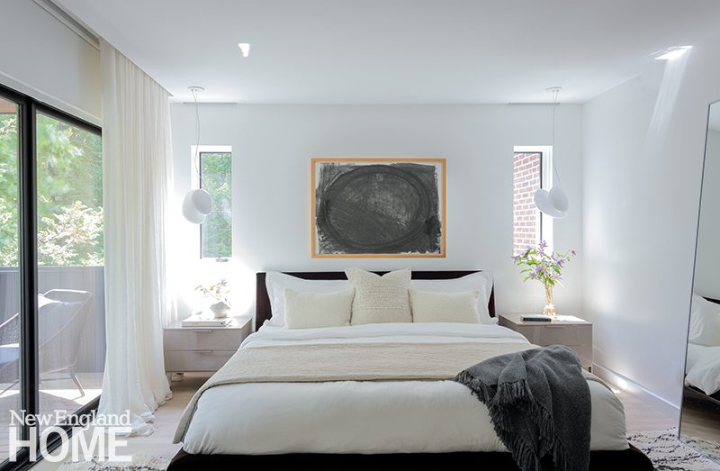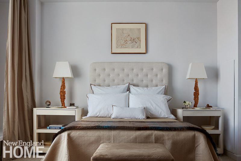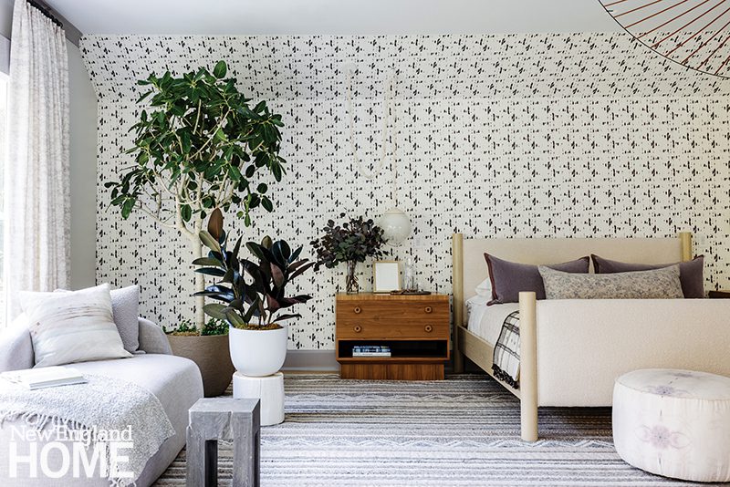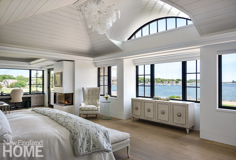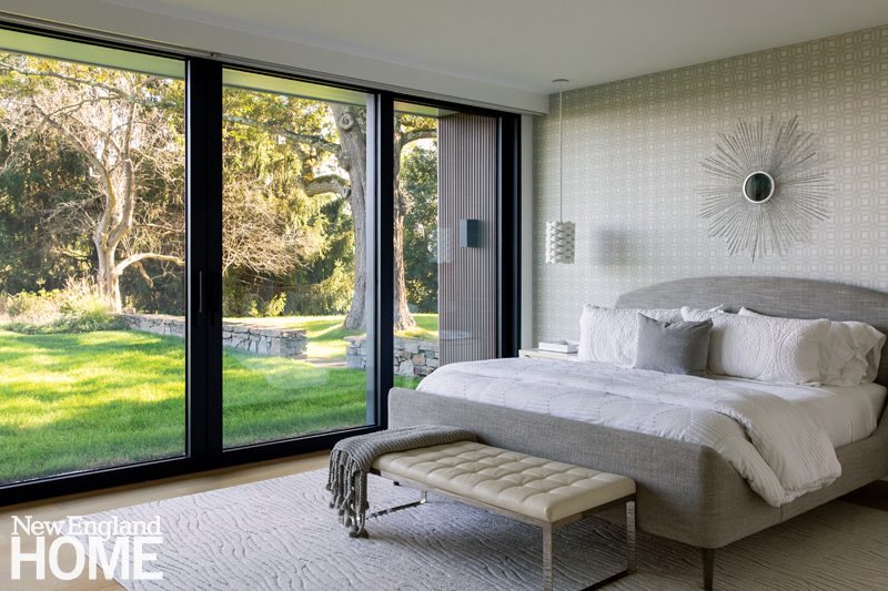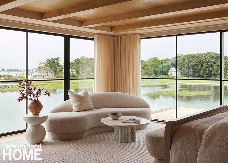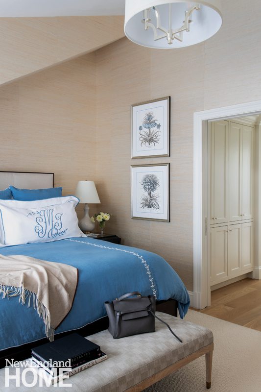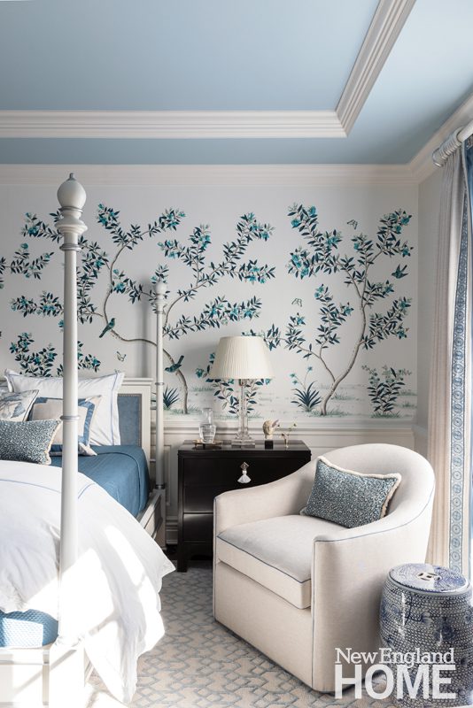 Duffy lets the natural world deliver the color in the main living areas, but she indulges her own favorite hues in the home’s four bedrooms, each with its own distinctive design. A Palecek chandelier cascades over an Oly Studio bed in this blue-tinged guest room, which has a bone-inlay nightstand and oversized shell sconces by Made Goods.