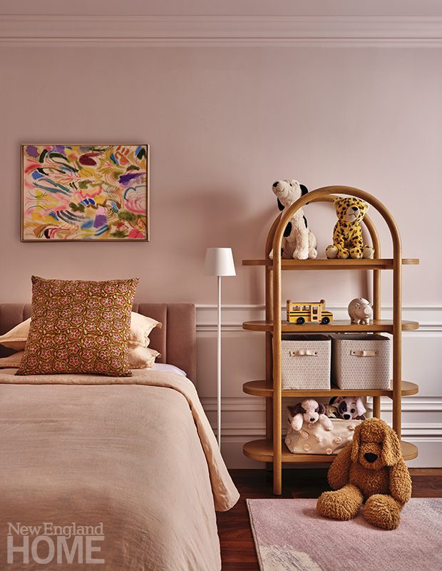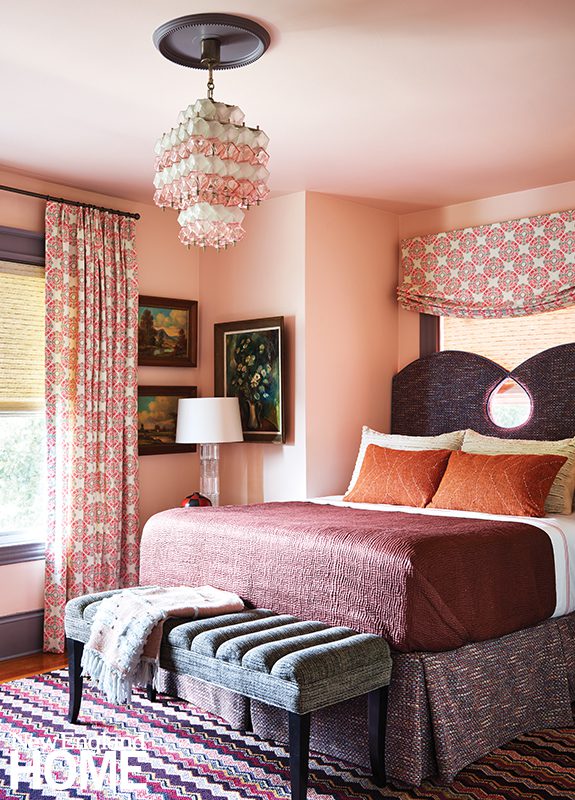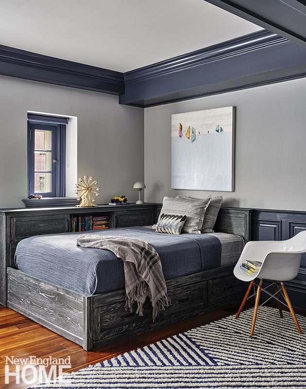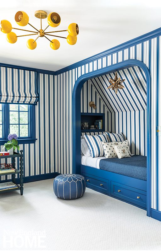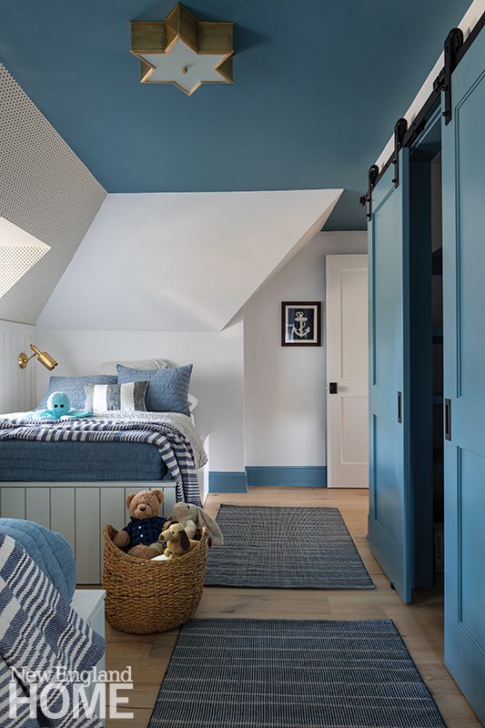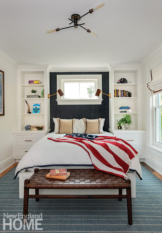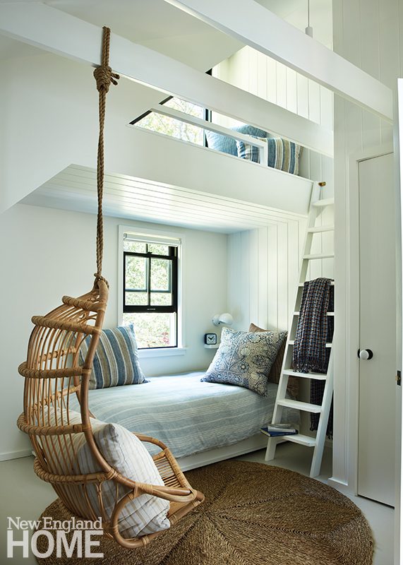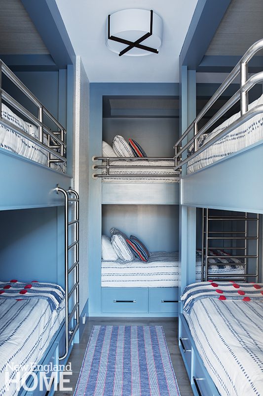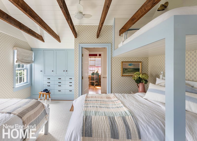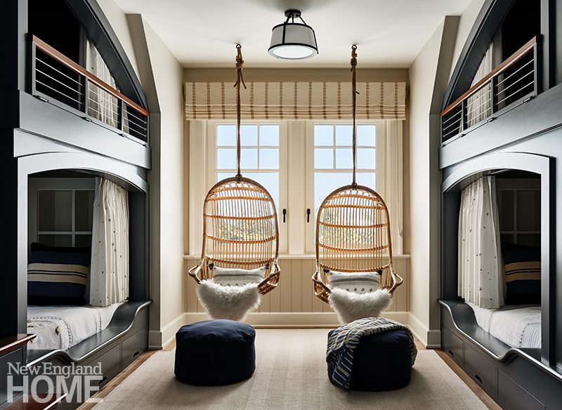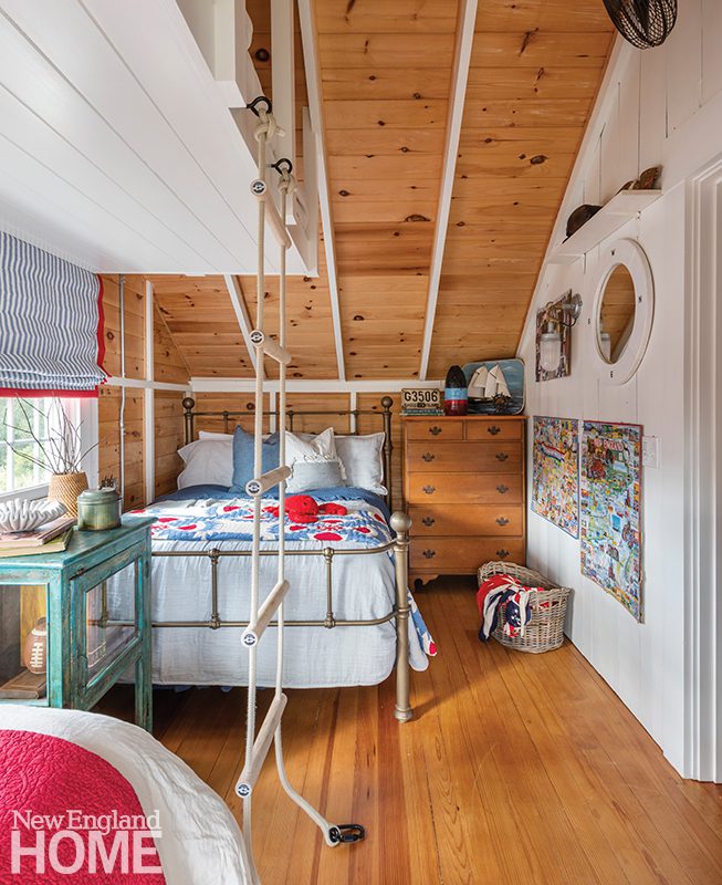Three boys share this reimagined second-floor bedroom. When the trio demanded bunk beds to match those in their sisters’ room, interior designer Patti Watson opted for a stowable rope ladder to save space in the tight confines. The room utilizes an antique brass bed and a glass-sided cabinet from the owners’ collection.