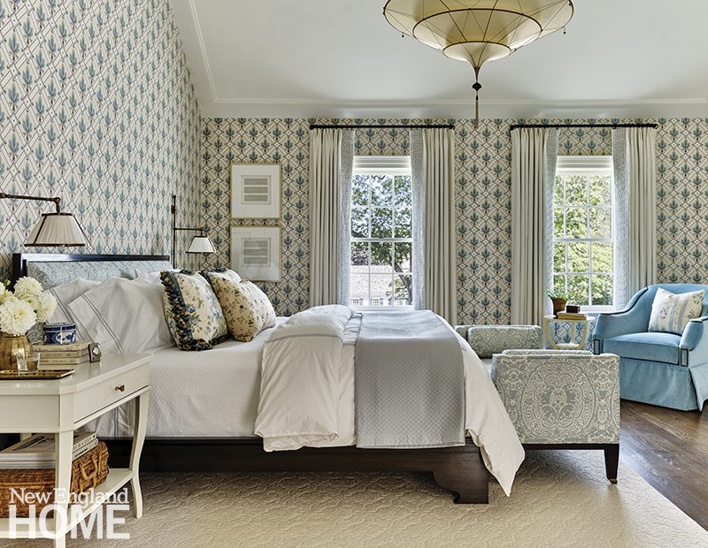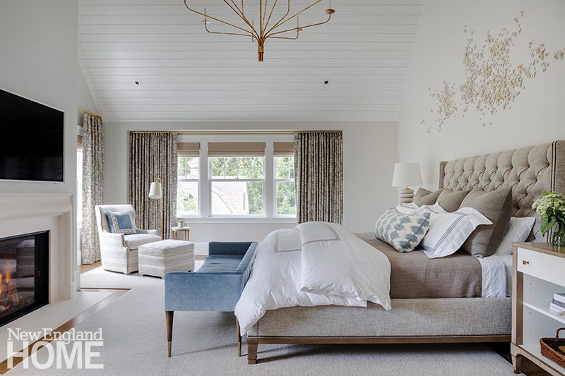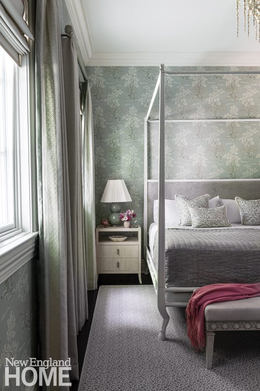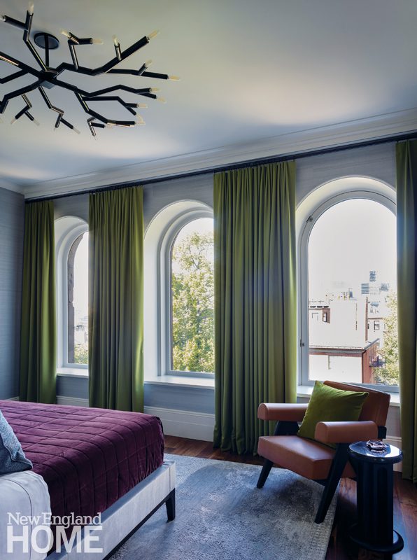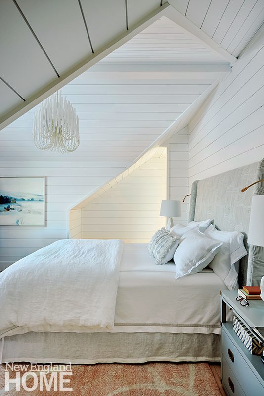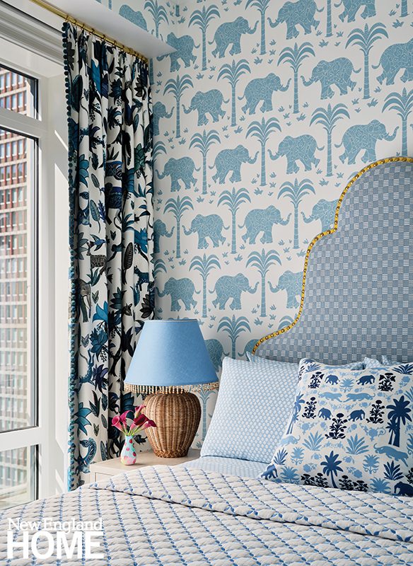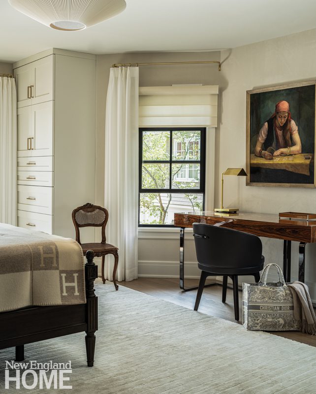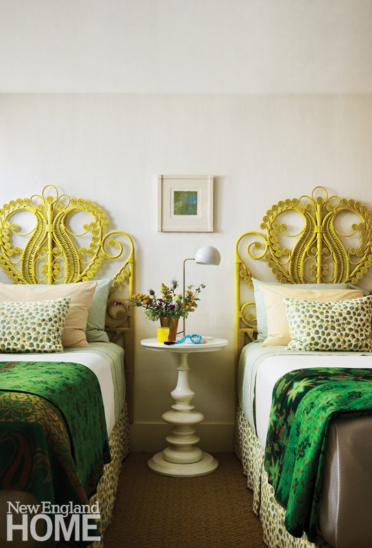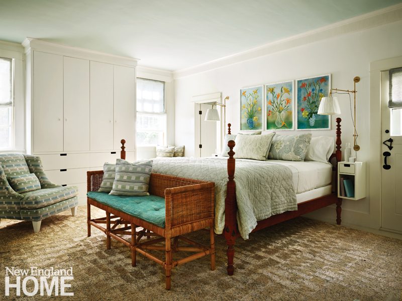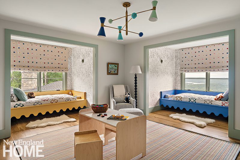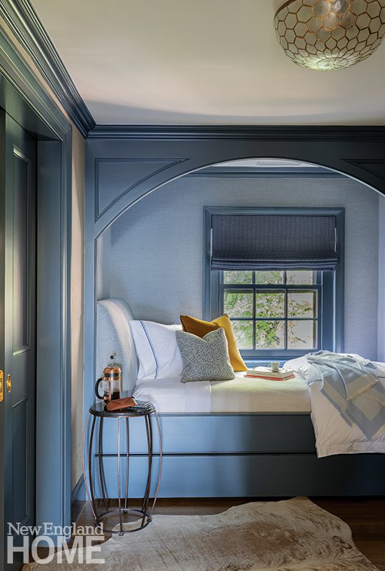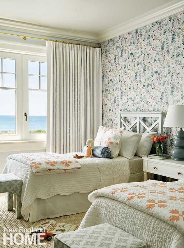 Three boys share this reimagined second-floor bedroom. When the trio demanded bunk beds to match those in their sisters’ room, interior designer Patti Watson opted for a stowable rope ladder to save space in the tight confines. The room utilizes an antique brass bed and a glass-sided cabinet from the owners’ collection.