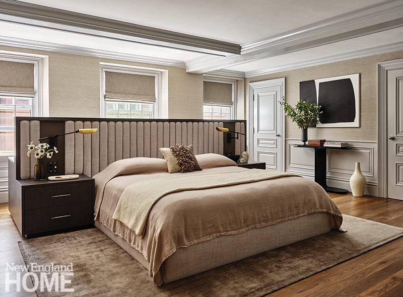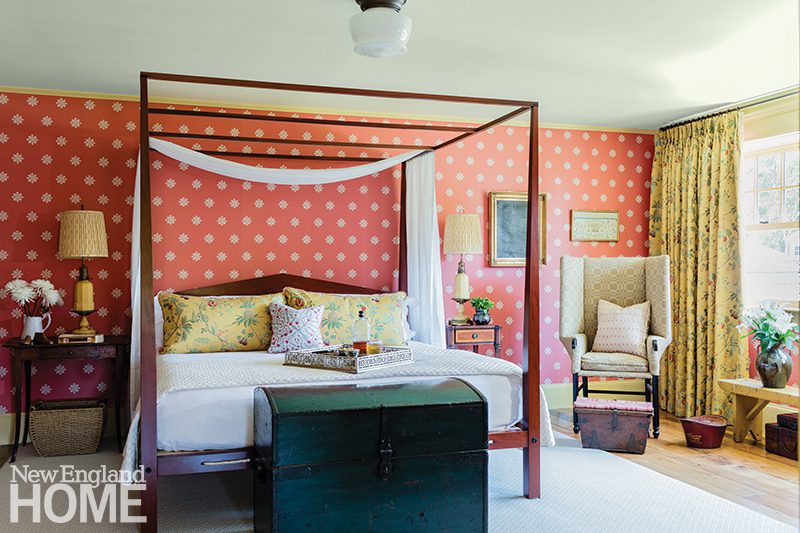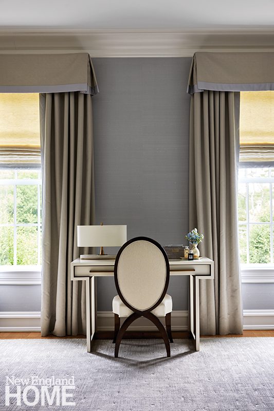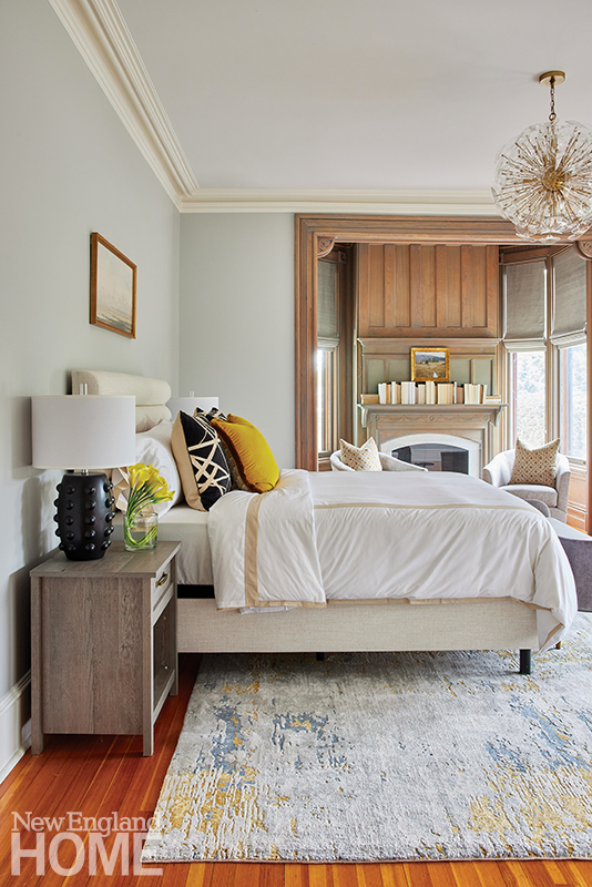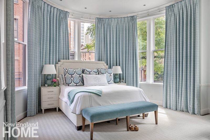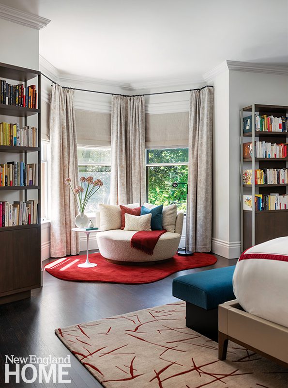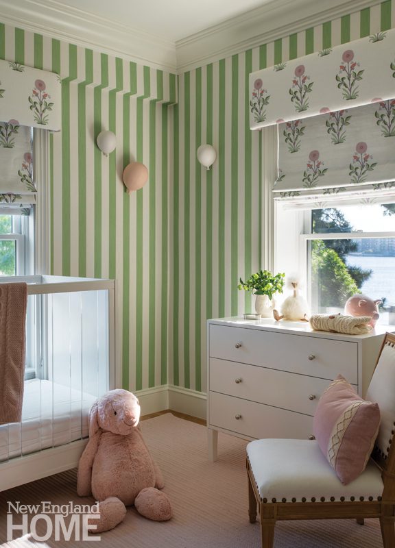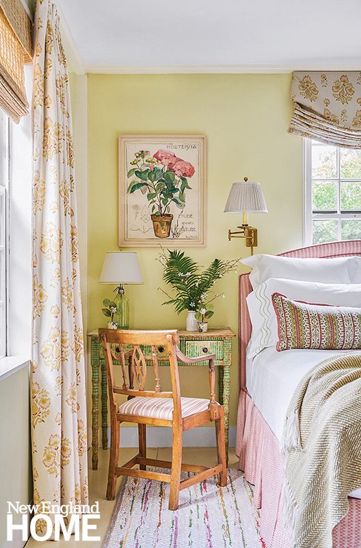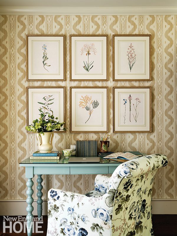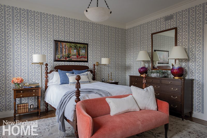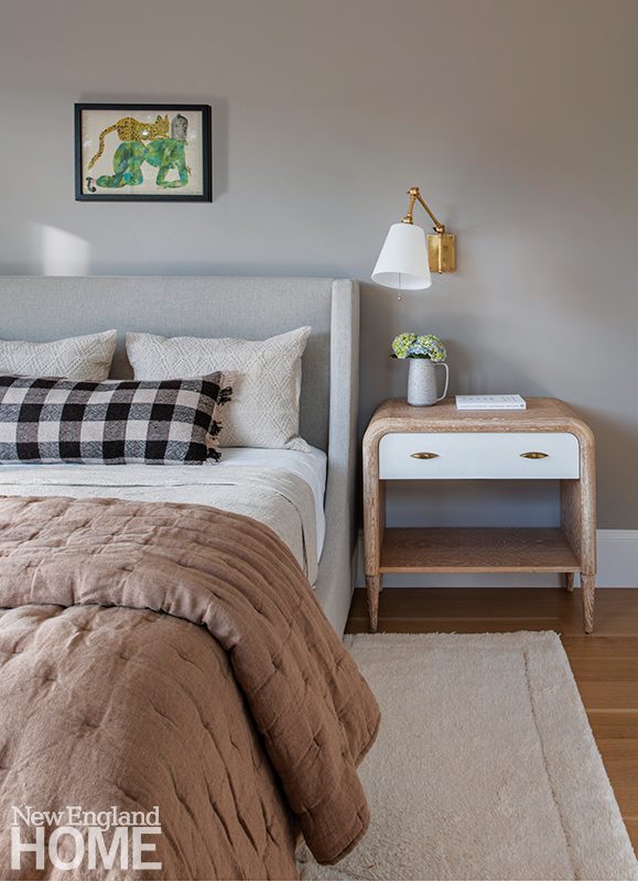 Three boys share this reimagined second-floor bedroom. When the trio demanded bunk beds to match those in their sisters’ room, interior designer Patti Watson opted for a stowable rope ladder to save space in the tight confines. The room utilizes an antique brass bed and a glass-sided cabinet from the owners’ collection.