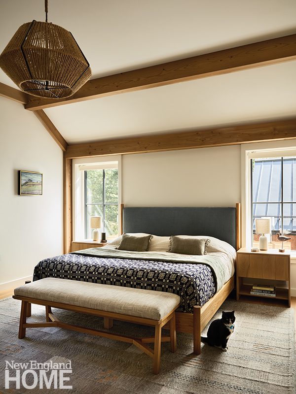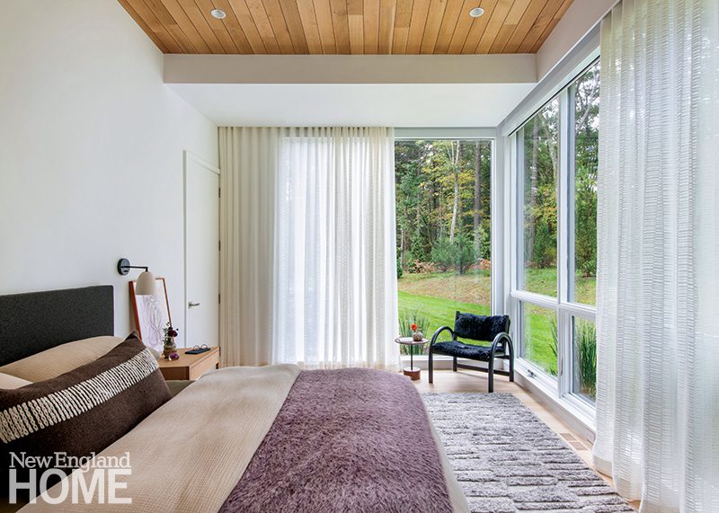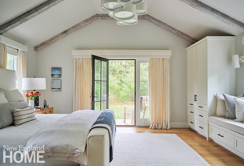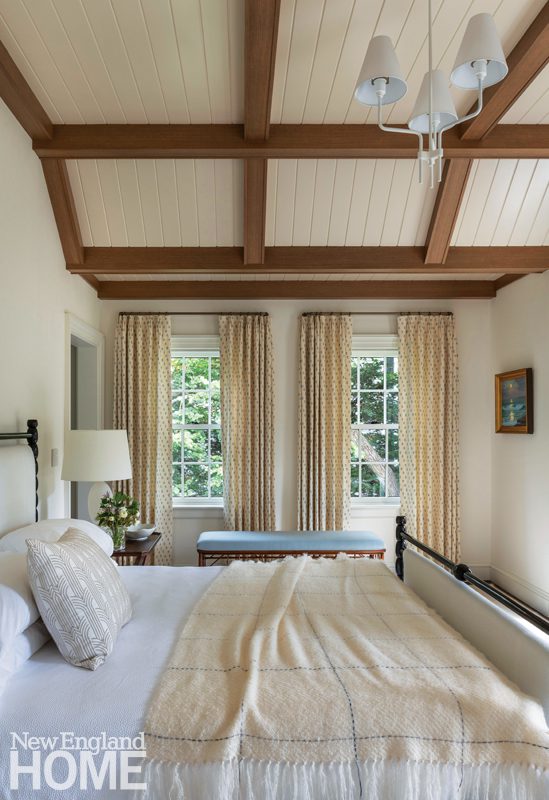 The primary bedroom is cozy and calm; whitewashed wood planks add visual interest to the vaulted ceiling, and the corner windows are treated with soft off-white curtains and taupe-gray shades.