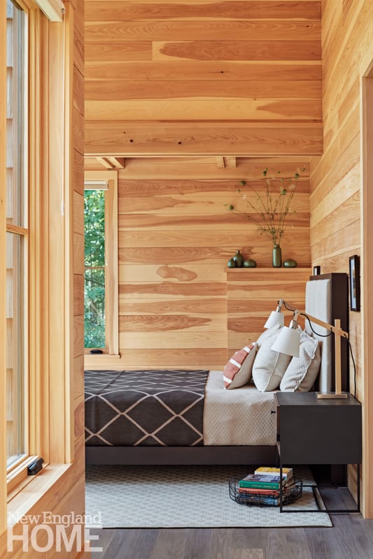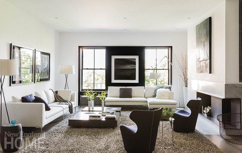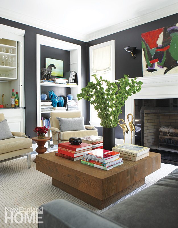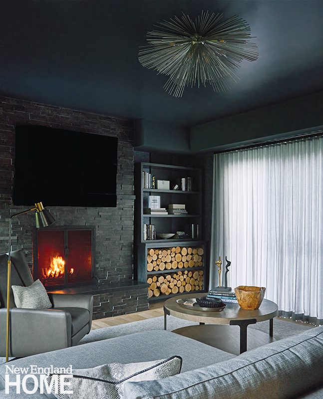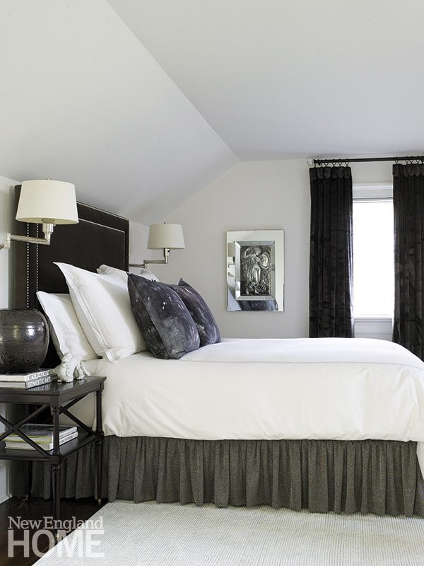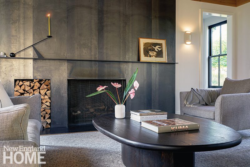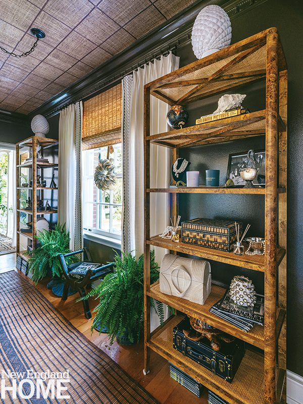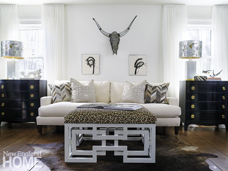 French-style chairs and an arts and crafts-style chest impart historical touches that give the room greater visual depth, Arnold believes, than if you’d simply “popped in all modern forms.” Floral fabric connects the fauteuils to the landscape. A cowhide rug keeps things contemporary, as does the mirror, which evokes a porthole while complementing the curves of the table and Hinkley pendant.