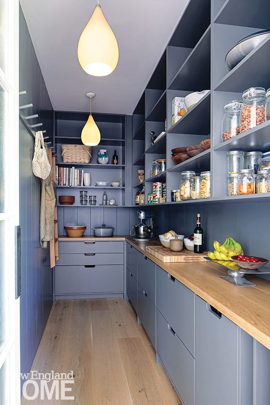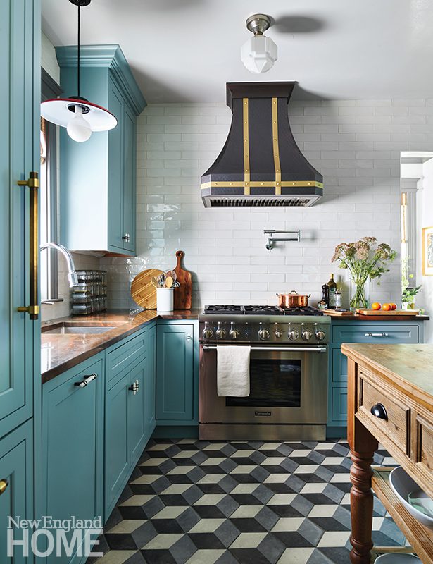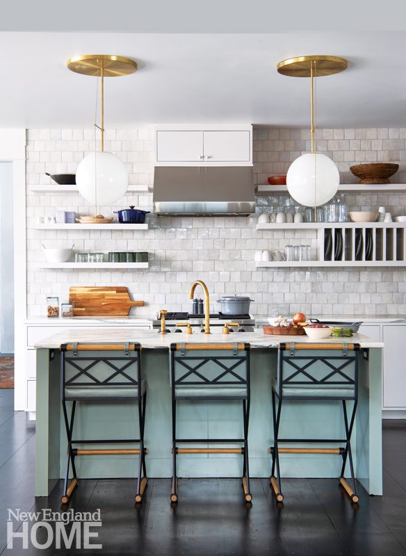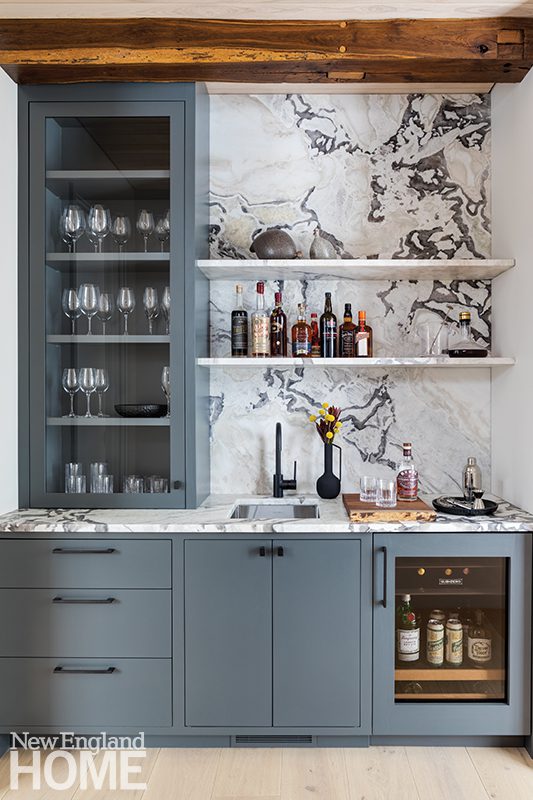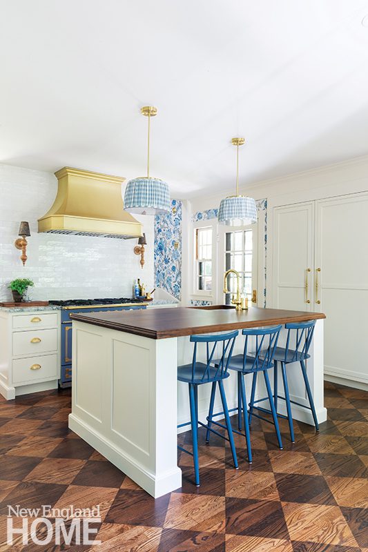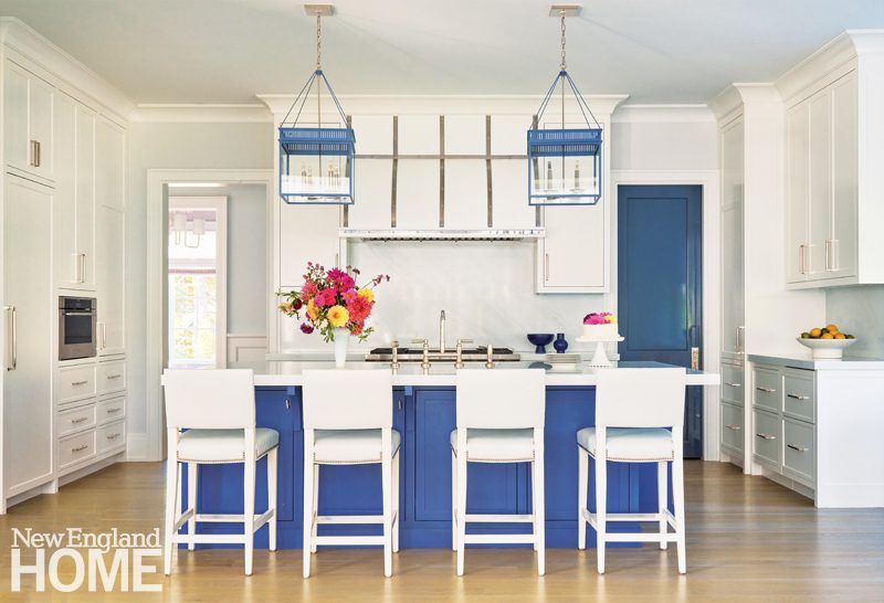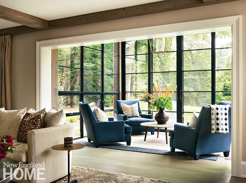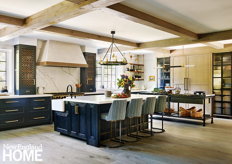 Some cabinetry and the kitchen’s central island showcase blue, the wife’s favored color, which designer Lisa Duffy also picked up in the Perennials fabric on the RH stools. Massive wood beams and white-oak floors add rustic charm to industrial touches like iron-and-glass cabinetry, steel-framed windows, and House of Rohl fixtures.