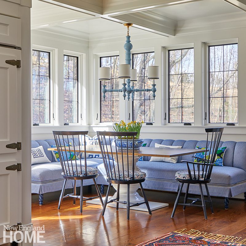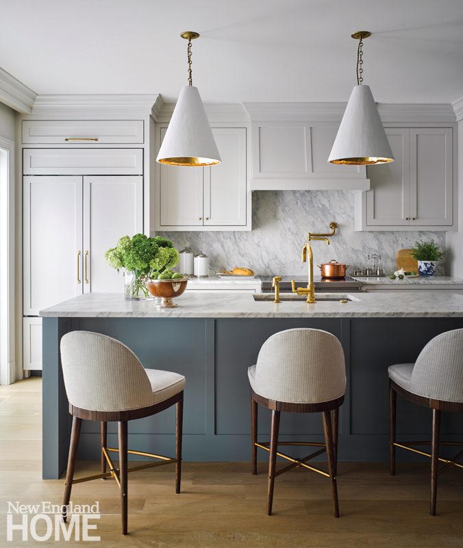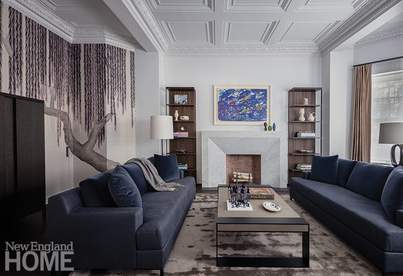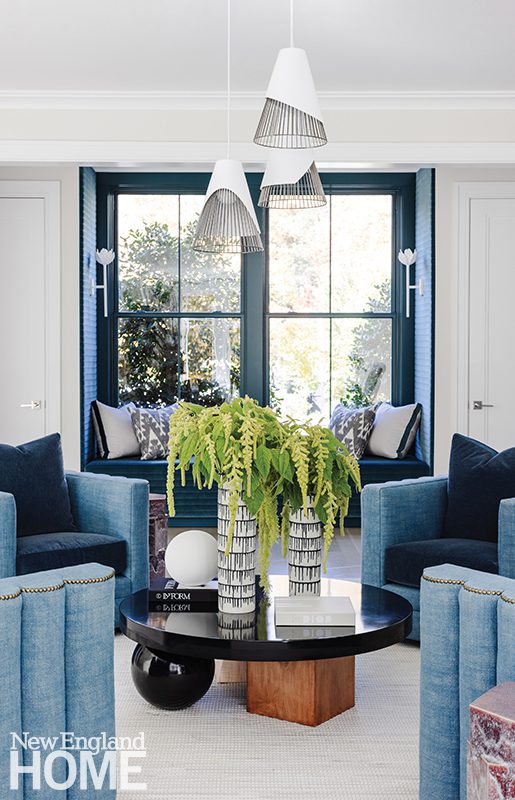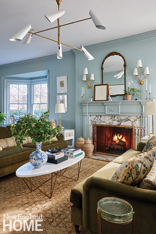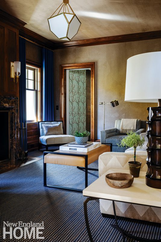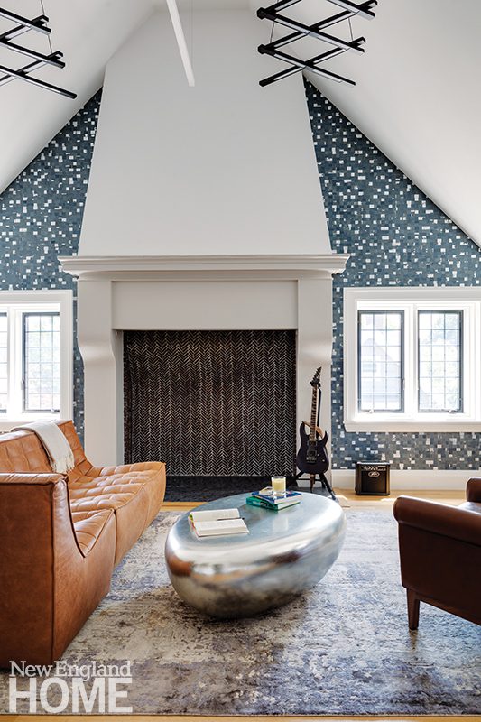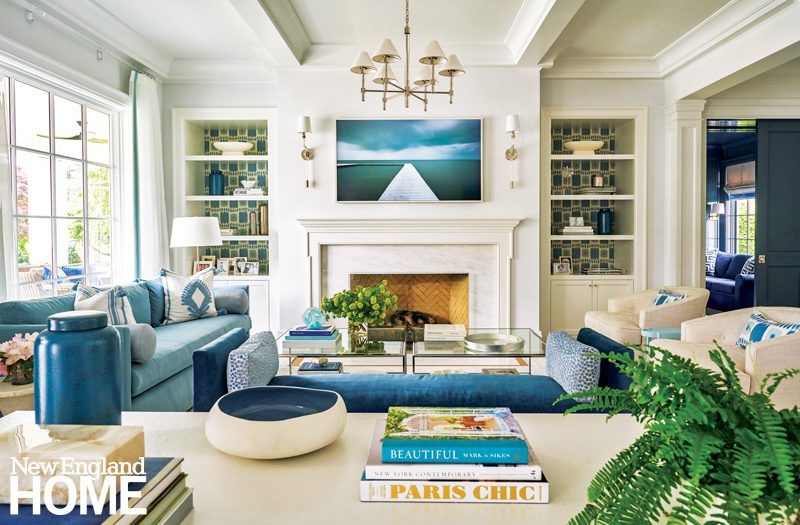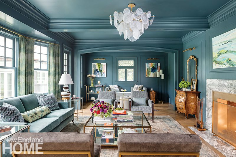As with the Shingle-style country houses he designed, William Ralph Emerson gave this Cambridge home a large living room that invites a crowd. With the original fireplace as the focal point of the room, interior designer Kate Maloney created an airy, modern vibe fortified with a custom O’Lampia chandelier. The chenille sofa is balanced with custom chairs by Partners in Design.