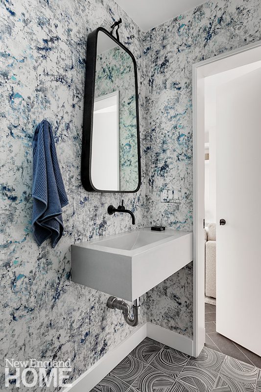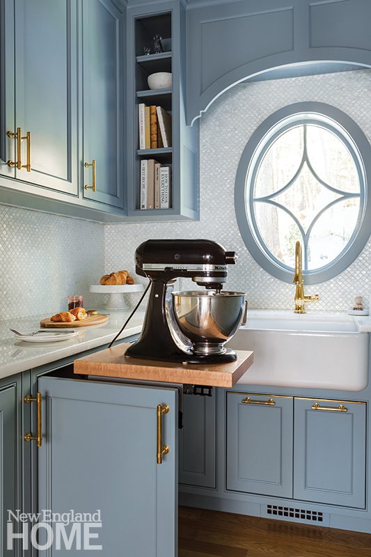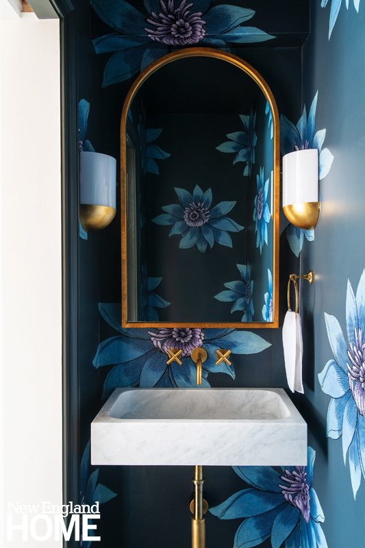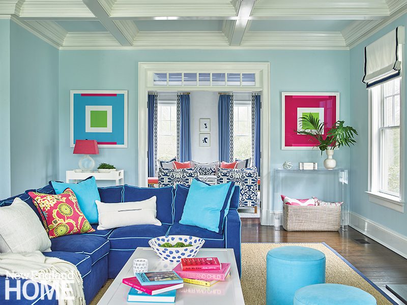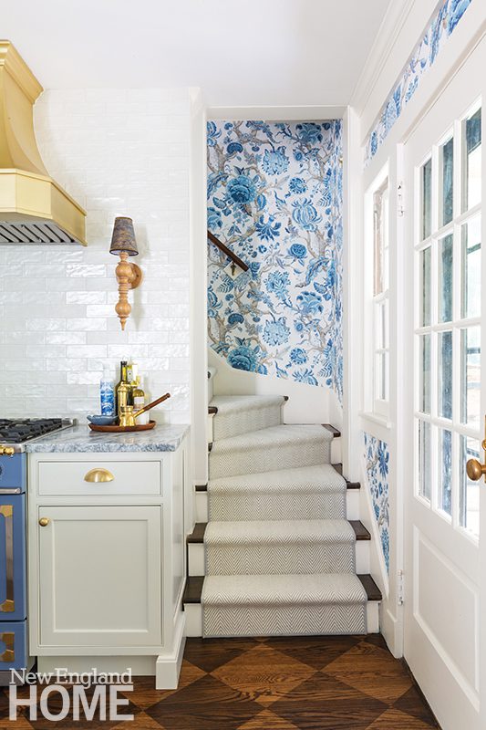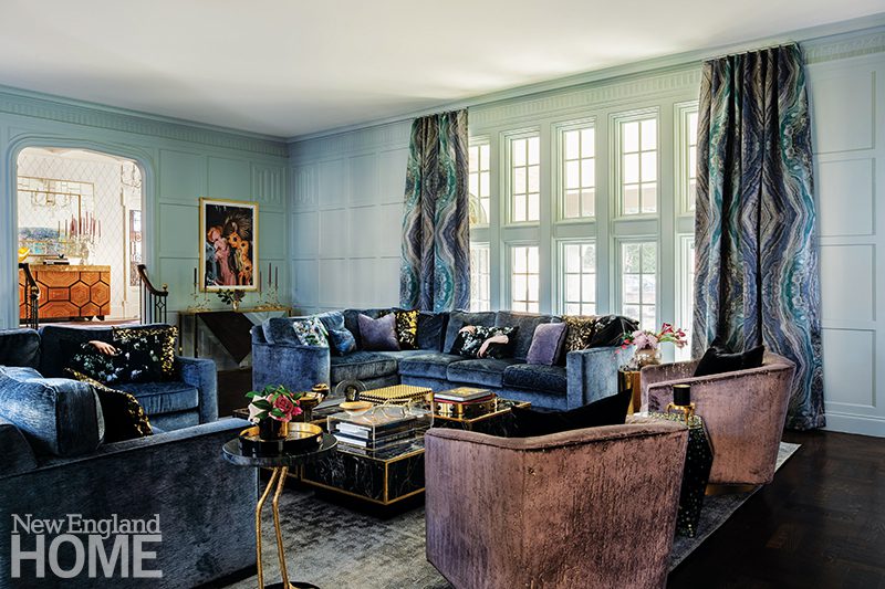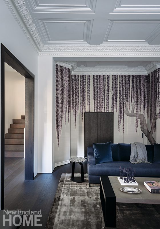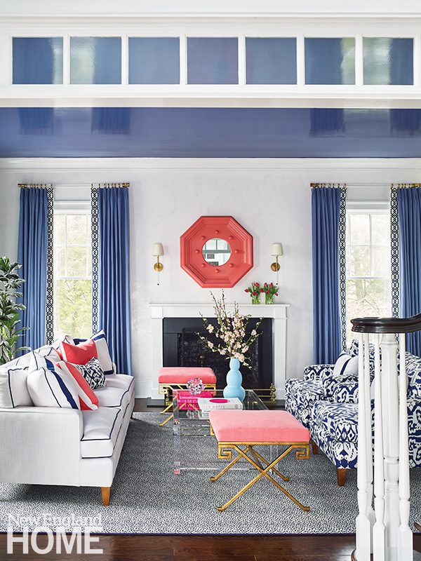 As with the Shingle-style country houses he designed, William Ralph Emerson gave this Cambridge home a large living room that invites a crowd. With the original fireplace as the focal point of the room, interior designer Kate Maloney created an airy, modern vibe fortified with a custom O’Lampia chandelier. The chenille sofa is balanced with custom chairs by Partners in Design.