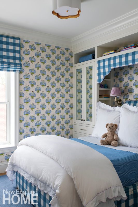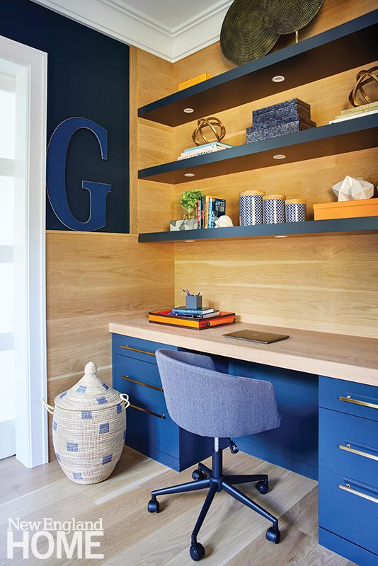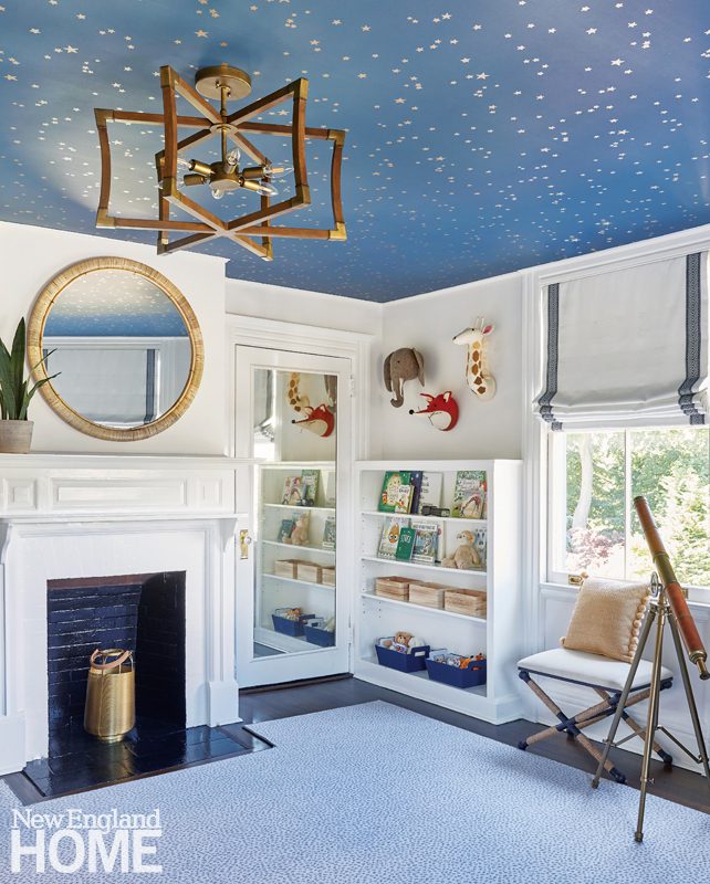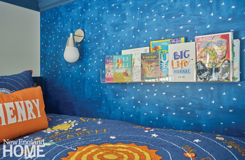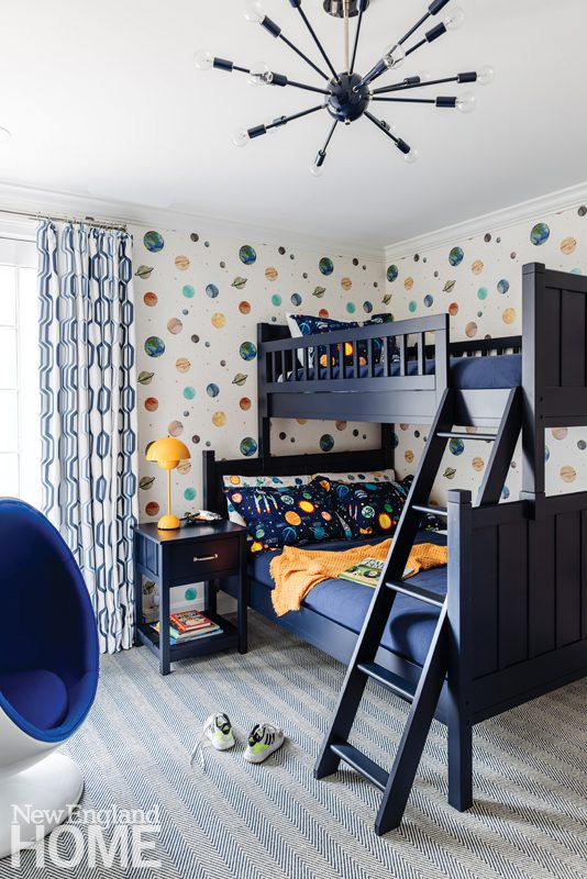Filled with blue notes, the boys’ room was furnished with Newport Cottages bunks fitted with Crate & Barrel bedding in a solar-system motif. Designer Georgia Zikas added the orange acrylic Philippe Starck side table because it felt very “futuristic” to the boys. The planet mobile and artwork are from Etsy.