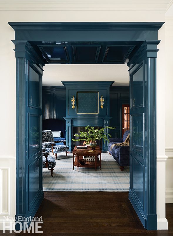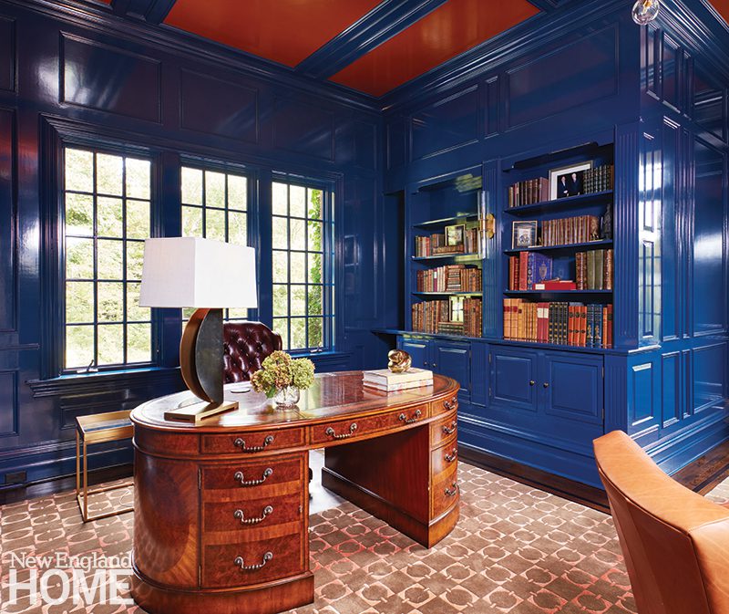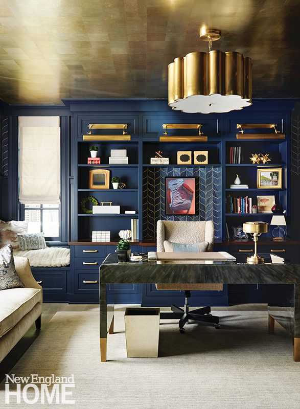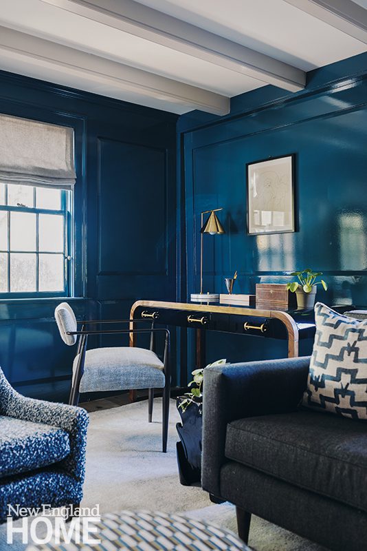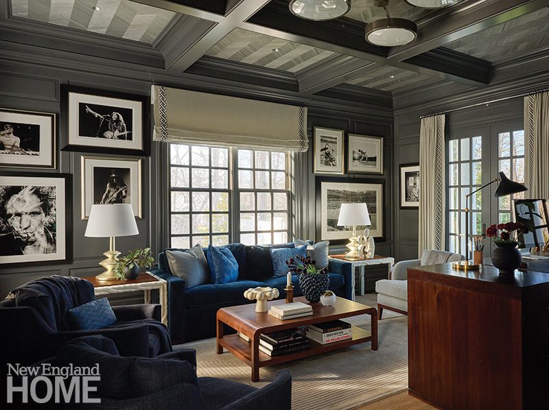 Using a rich palette of dark blues, grays, and tans, interior designer Christina Roughan renovated this New Canaan home office into a multipurpose room that includes cozy sitting areas for overflow party guests, a wall covered with photos of rock and roll icons who have inspired the guitar-playing owner, and a desk for getting work done.