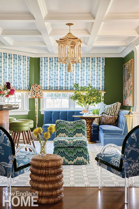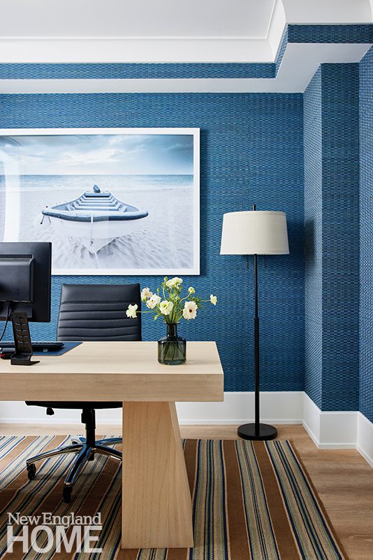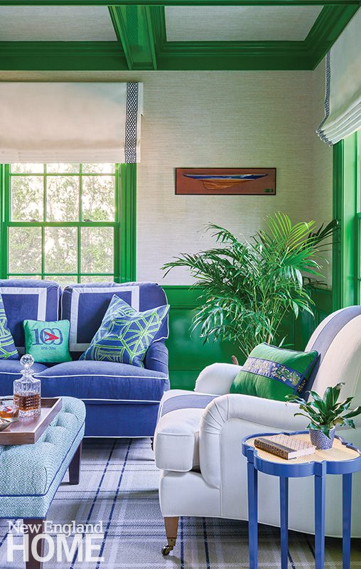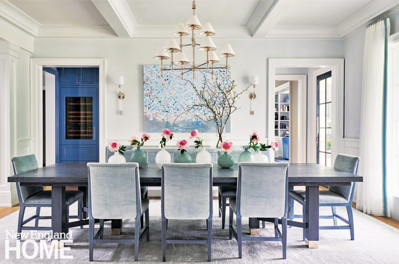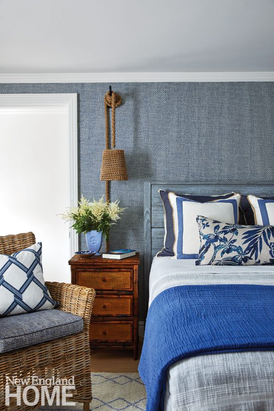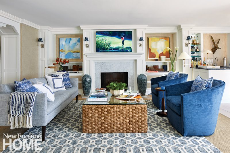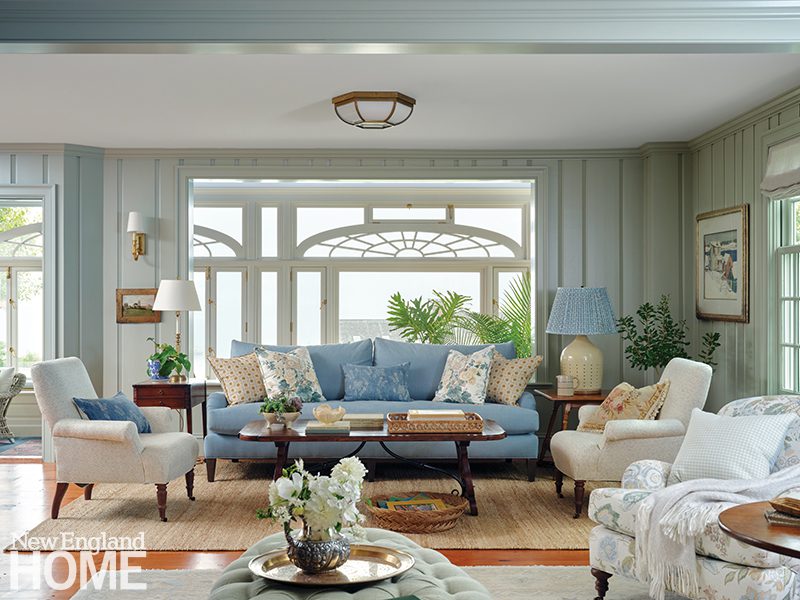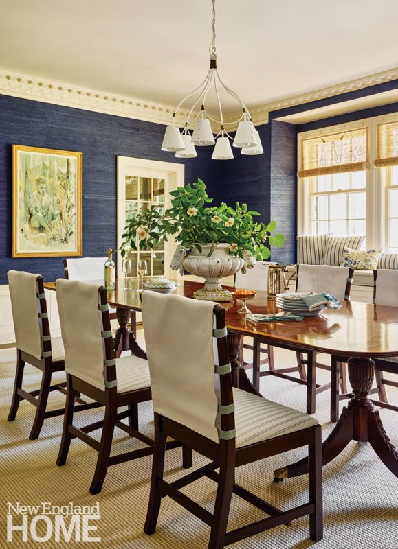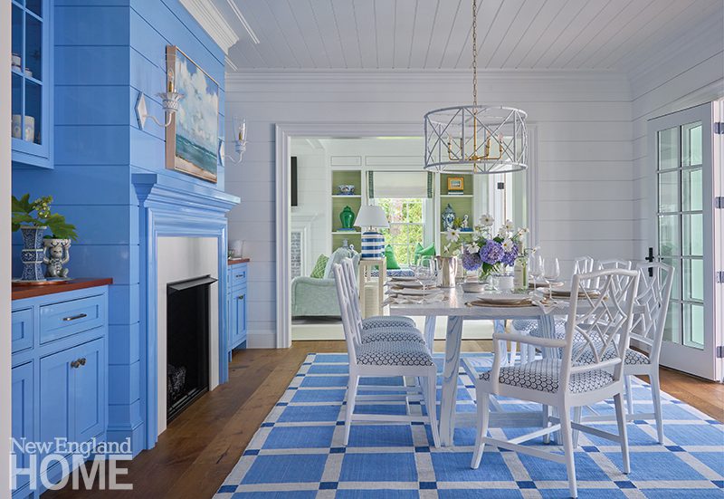 Nantucket is all about entertaining,” says Bill Richards, a partner at Gary McBournie, Inc. The client’s own dining chairs were recovered in a Galbraith & Paul fabric, and decorative artist Deidre Mannix recolored a shell console (one of a pair). The nineteenth-century sailor-made woolie was sourced from Freeman’s auction house.