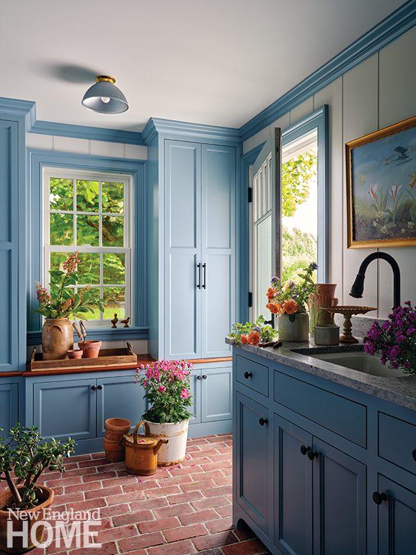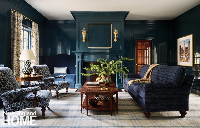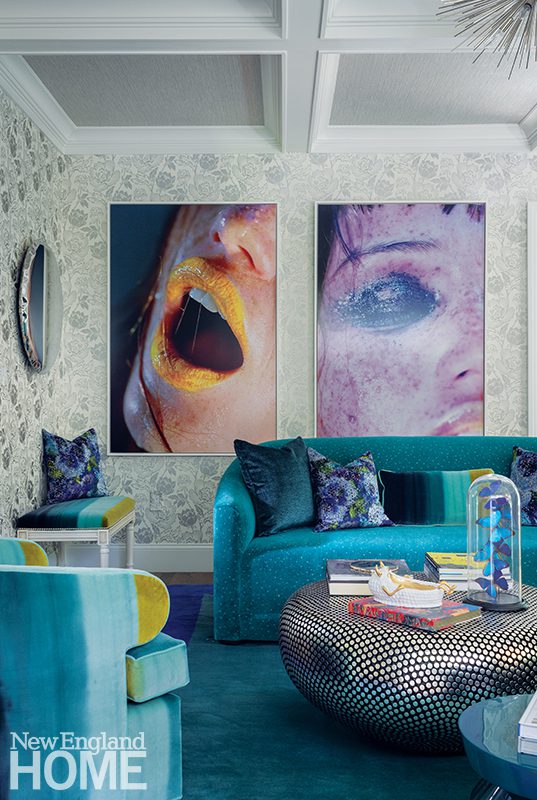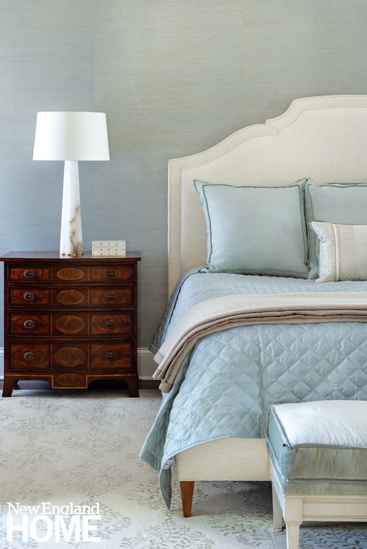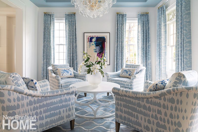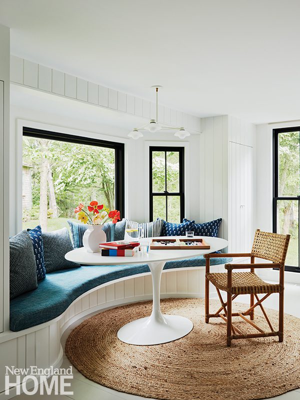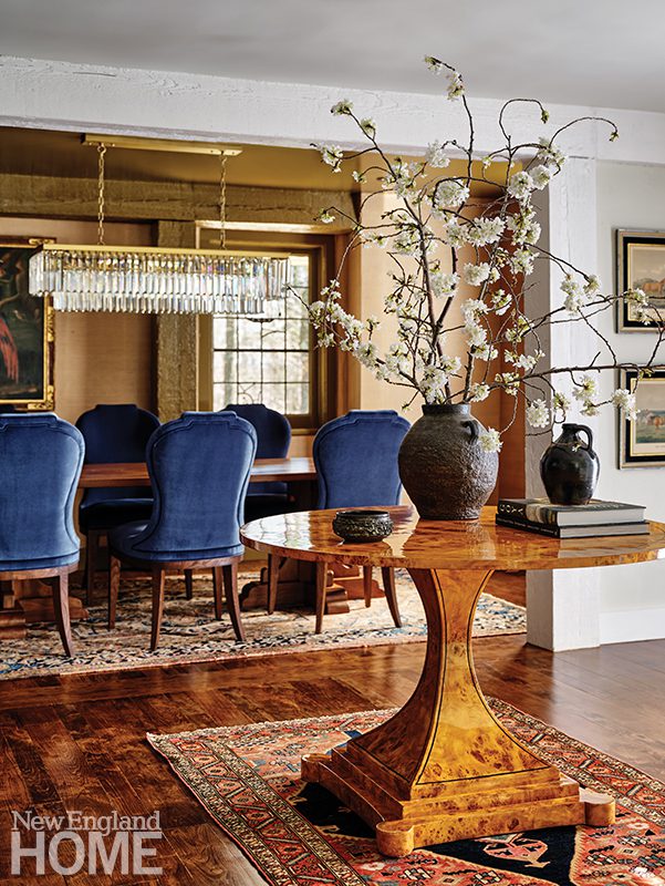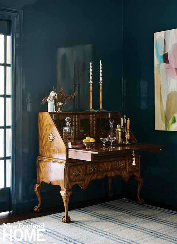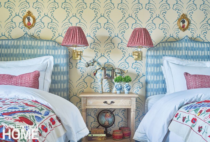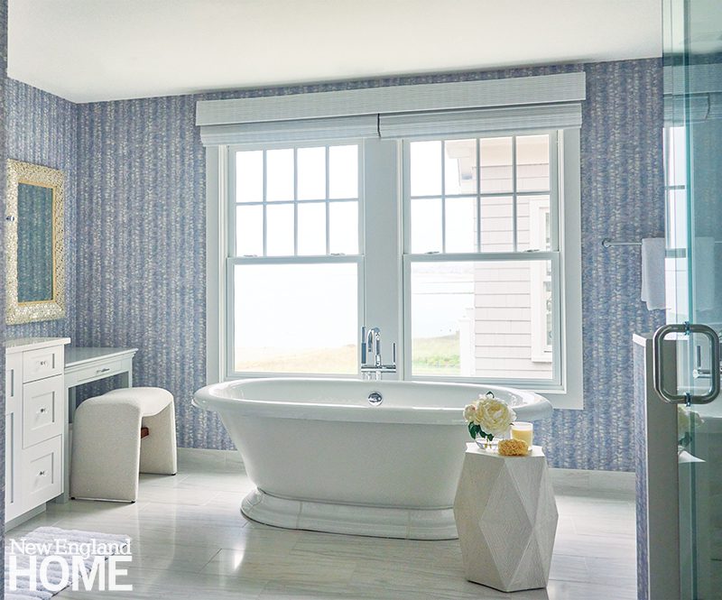 Nantucket is all about entertaining,” says Bill Richards, a partner at Gary McBournie, Inc. The client’s own dining chairs were recovered in a Galbraith & Paul fabric, and decorative artist Deidre Mannix recolored a shell console (one of a pair). The nineteenth-century sailor-made woolie was sourced from Freeman’s auction house.
