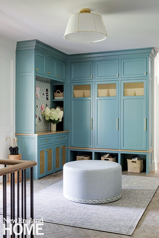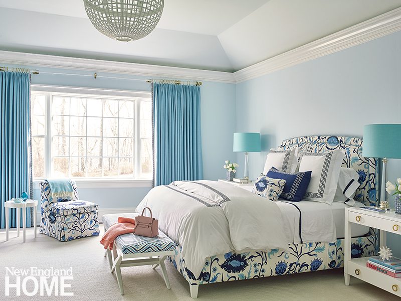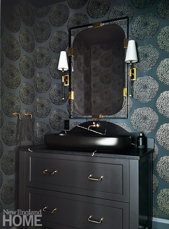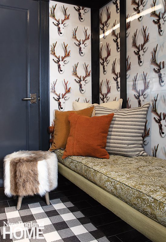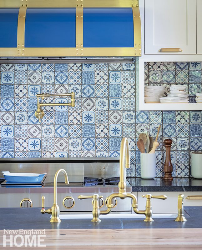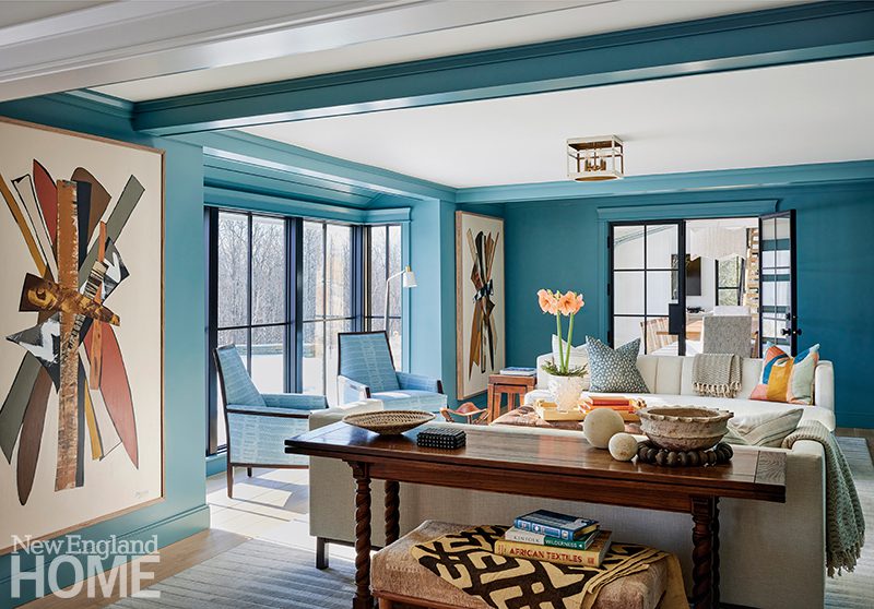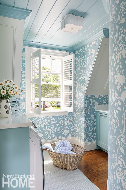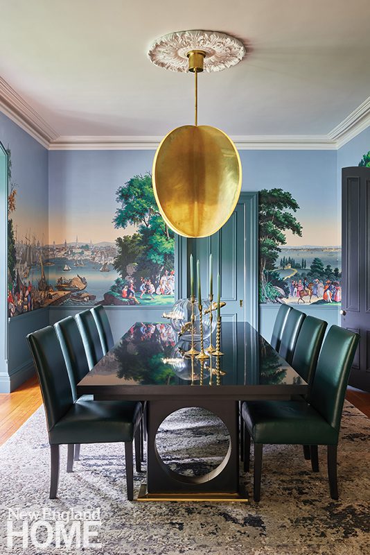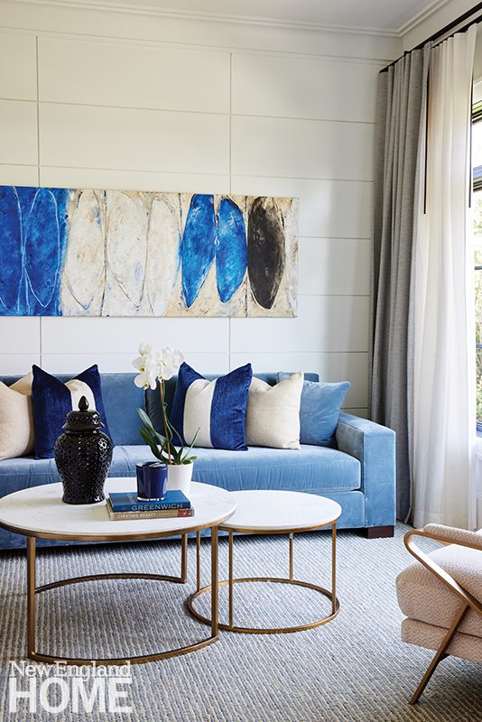 Nantucket is all about entertaining,” says Bill Richards, a partner at Gary McBournie, Inc. The client’s own dining chairs were recovered in a Galbraith & Paul fabric, and decorative artist Deidre Mannix recolored a shell console (one of a pair). The nineteenth-century sailor-made woolie was sourced from Freeman’s auction house.