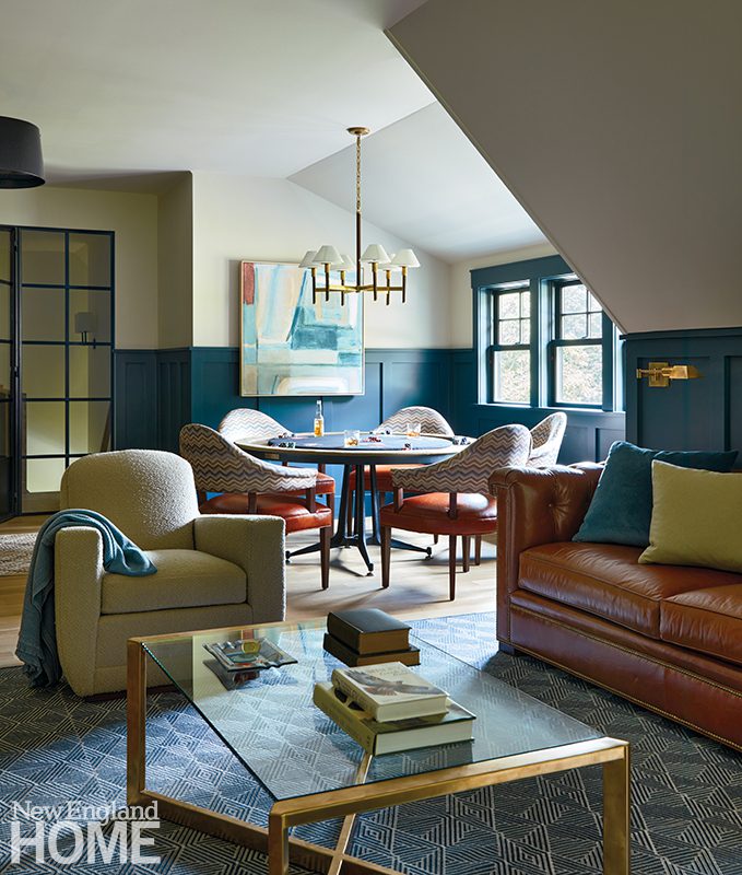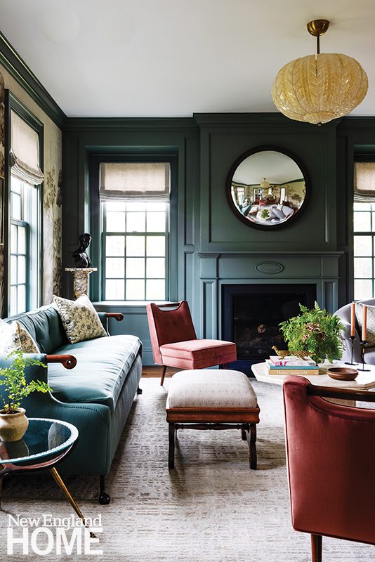 Sherwin-Williams’s moody Still Water paint in semigloss gives the living room a warm, enveloping feel. Designer Erin Gates mixed traditional pieces like the homeowners’ own antique chest with more modern details such as the Visual Comfort & Co. chandelier with its milky handblown glass disks. She added shots of chartreuse, in the Kelly Wearstler drapery fabric and a toss pillow, to play off the artwork.