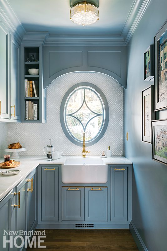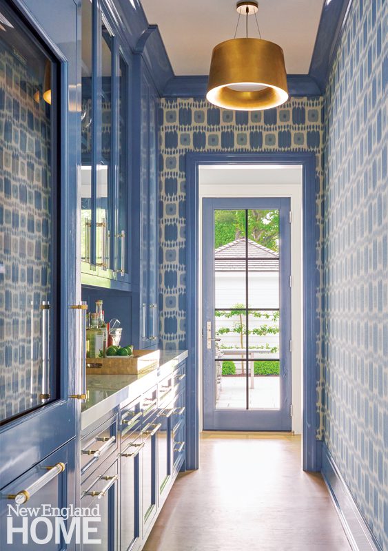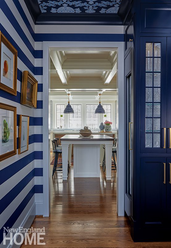 Adding to the allure of the butler’s pantry is the ceiling’s patterned wallpaper. The small room is as functional as it is beautiful with a wine column for beverages, a coffee station tucked behind countertop cabinet doors, and a second dishwasher. The striped wallpaper on the opposite wall is reflected in the mirrored cabinet doors.