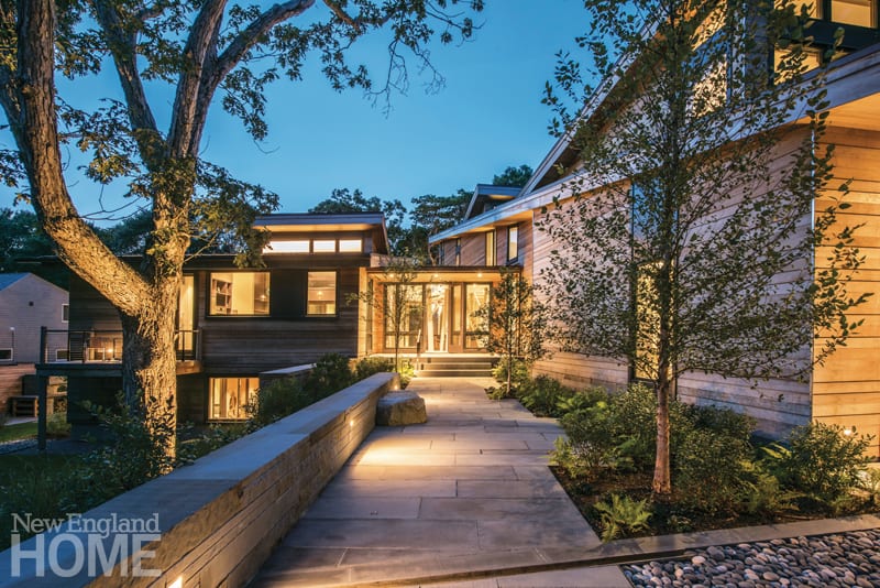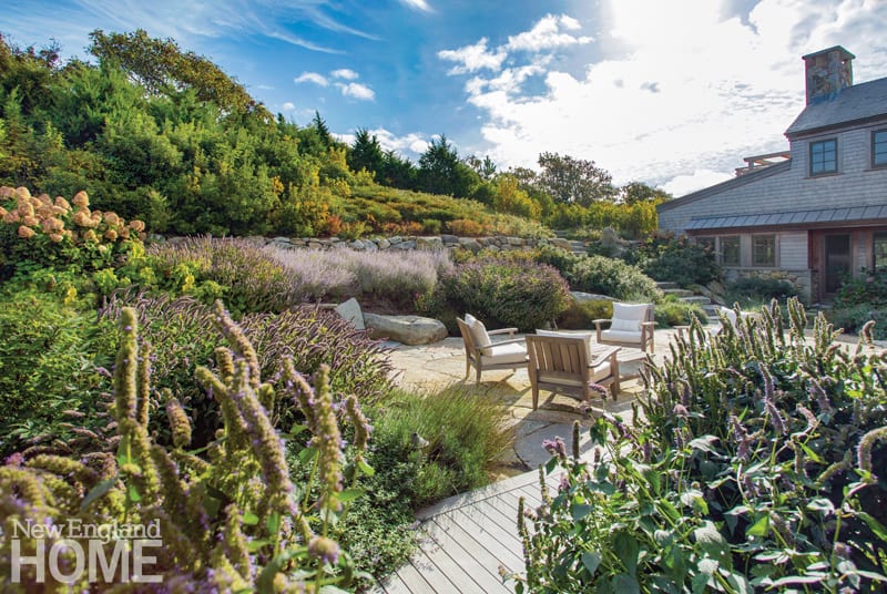 A raised terrace and infinity pool extend into the backyard, which abuts a saltwater pond with views of the bay beyond. Connecting landscaping and hardscaping with the architecture was an important element of the design for Polhemus Savery DaSilva, the firm responsible for the architecture, landscape architecture, and construction of the house.