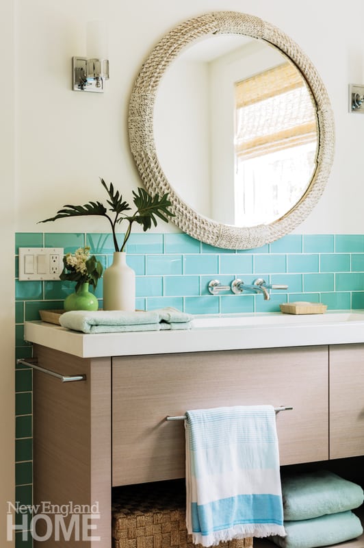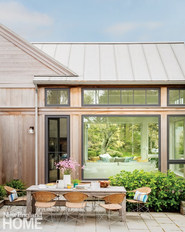 Oversize two-over-two windows enhance the connection to the landscape (and get around Nantucket’s prohibition on windows without muntins). Even the sliding doors are taller than normal, to take advantage of views. The architects obliged the owners’ request for recliners with these sleek models from Design Within Reach, which sit in front of the wood-burning fireplace.
