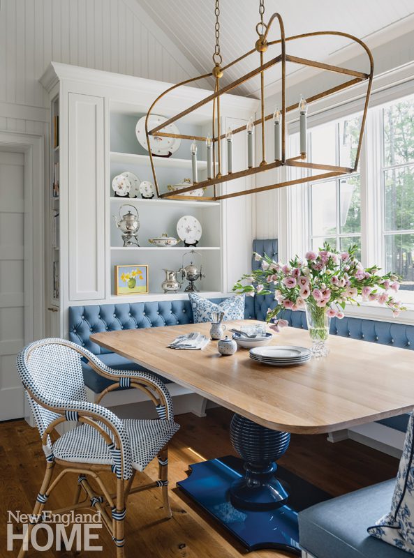 A spot for family dining was designed around a banquette on one side of the new island; the table base is from Dunes and Duchess, and the top was custom made by builder Palette Pro Painting & Renovation.