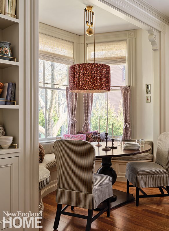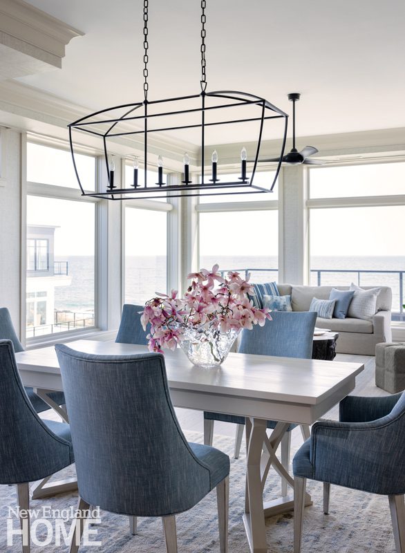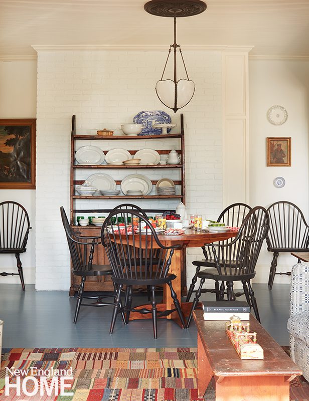 Nantucket is all about entertaining,” says Bill Richards, a partner at Gary McBournie, Inc. The client’s own dining chairs were recovered in a Galbraith & Paul fabric, and decorative artist Deidre Mannix recolored a shell console (one of a pair). The nineteenth-century sailor-made woolie was sourced from Freeman’s auction house.