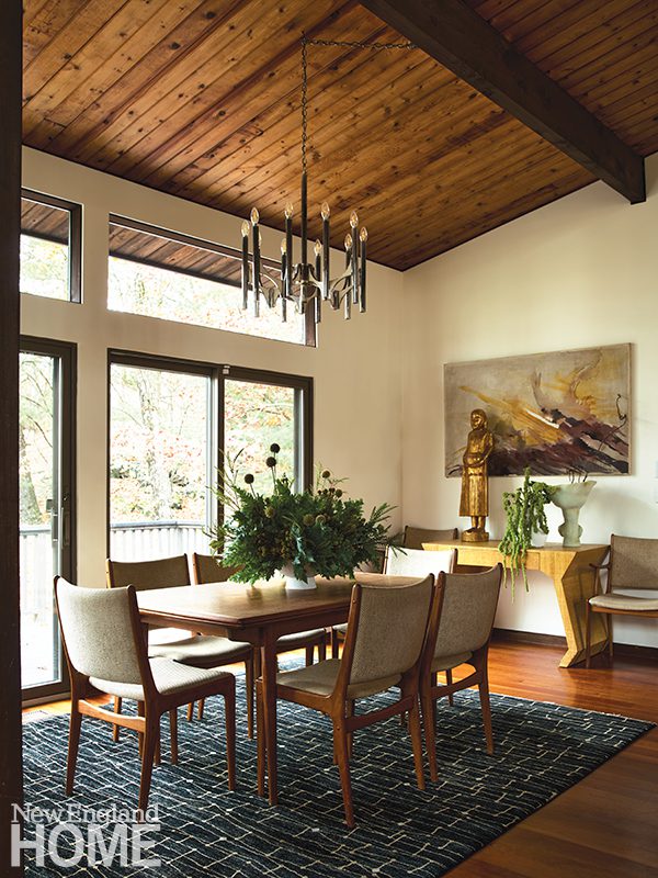 French-style chairs and an arts and crafts-style chest impart historical touches that give the room greater visual depth, Arnold believes, than if you’d simply “popped in all modern forms.” Floral fabric connects the fauteuils to the landscape. A cowhide rug keeps things contemporary, as does the mirror, which evokes a porthole while complementing the curves of the table and Hinkley pendant.