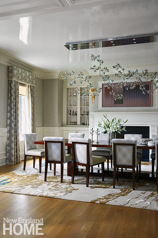 The color scheme continues in the dining room’s willow-pattern wallpaper from the Pluma line at Romo. Sinkin paired a Worlds Away table with side chairs in light-toned wood with caned backs and seats upholstered in blue-gray fabric. The sideboard is finished in woven grasscloth. The modern chandelier from Visual Comfort & Co. resembles a mobile.