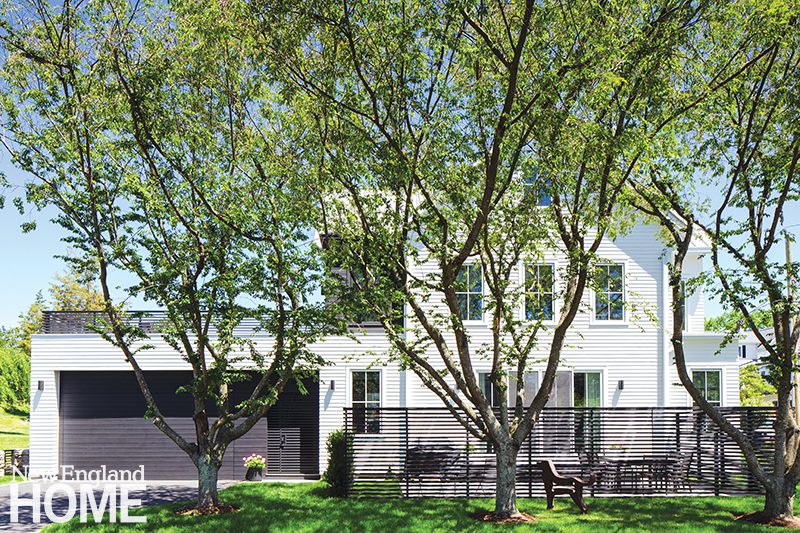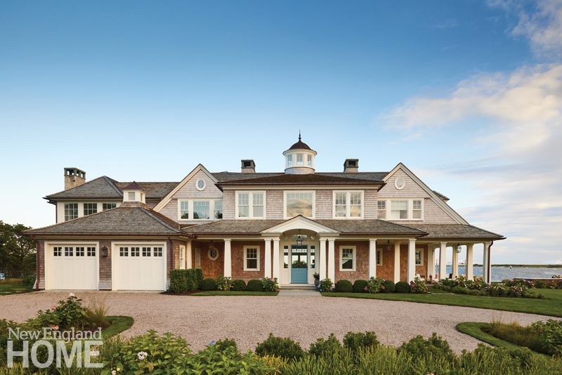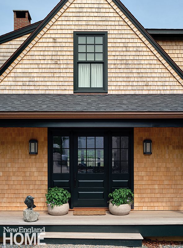 Shingle siding paired with painted horizontal board siding reinforce the traditional Shingle-style features of the new home, says Kerri Byrne, principal at Catalano Architects.