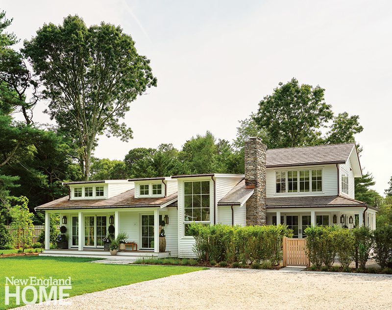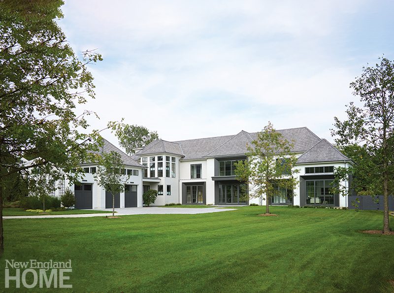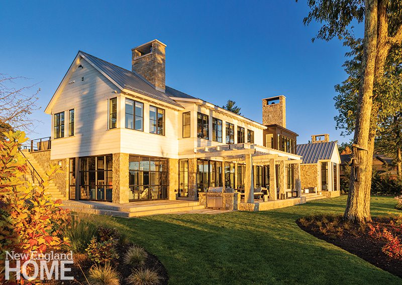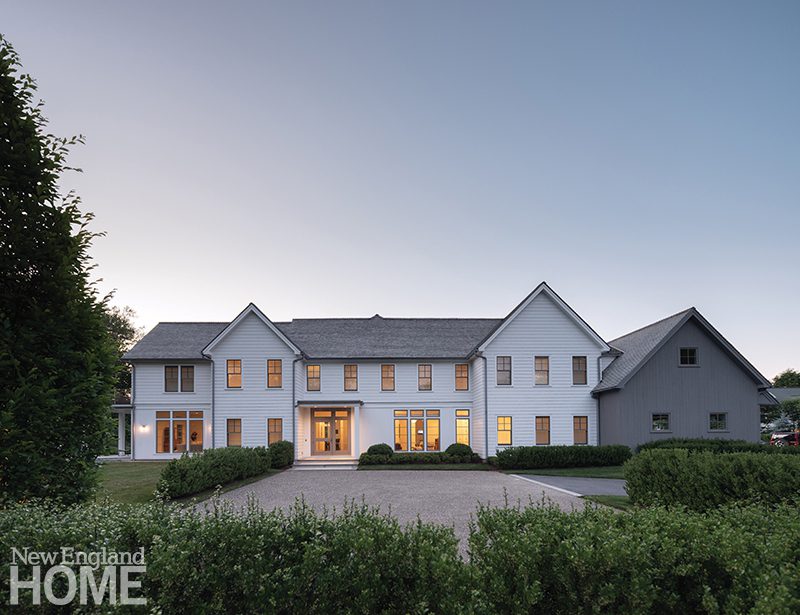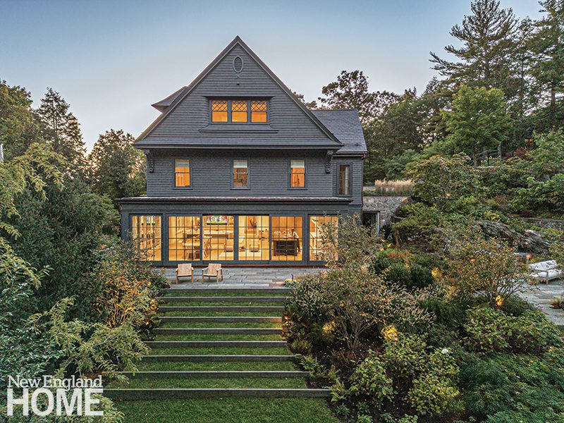 Working with the sloped topography, the team carved out land at the back of the house in order to create a walk-out garden level while still meeting the town’s twenty-four-foot height restriction for gabled roofs. “The house is really nestled into the land, with the back side walking out to a patio and the two-and-a-half stories above it exposed to the views,” Stephens says.