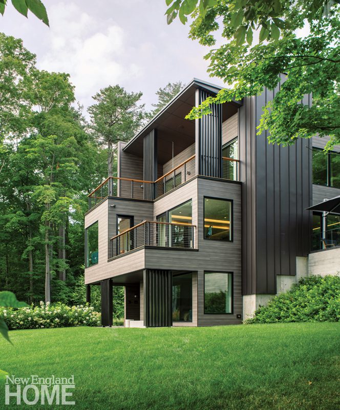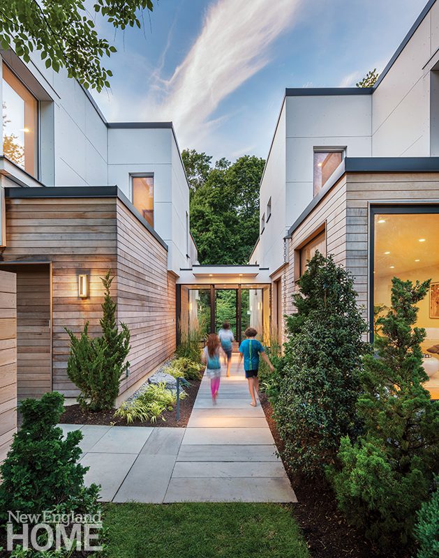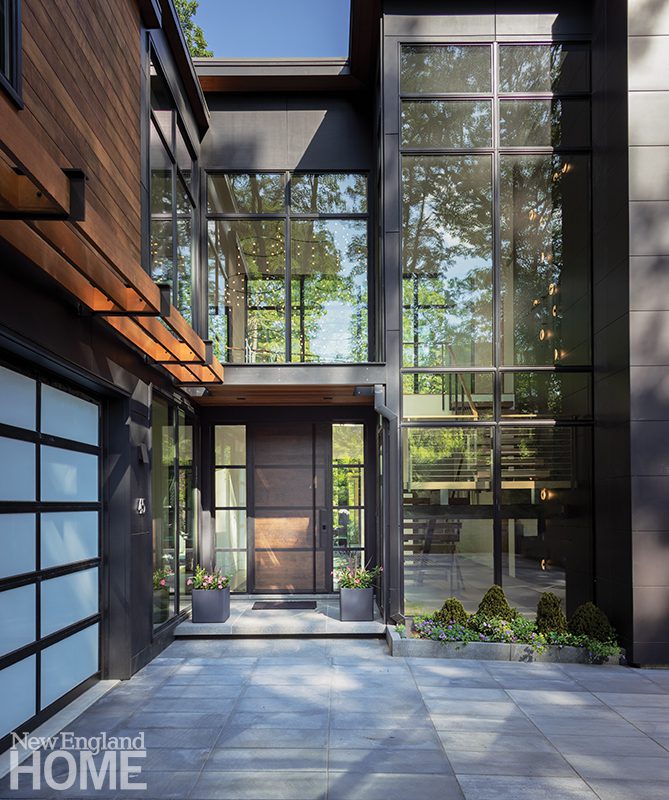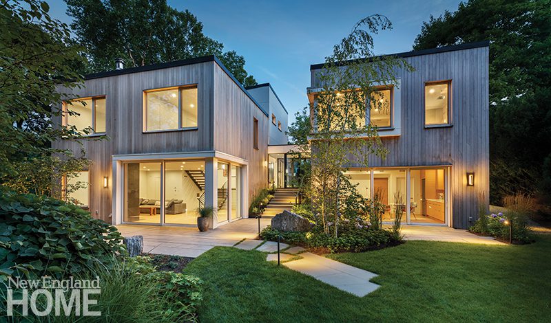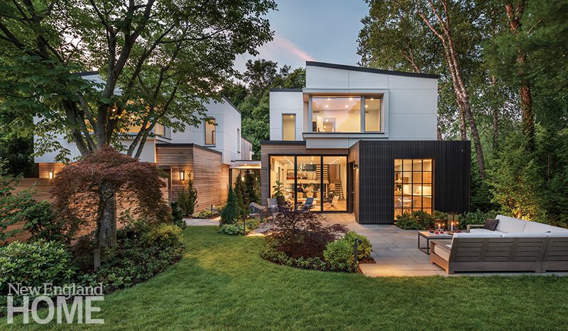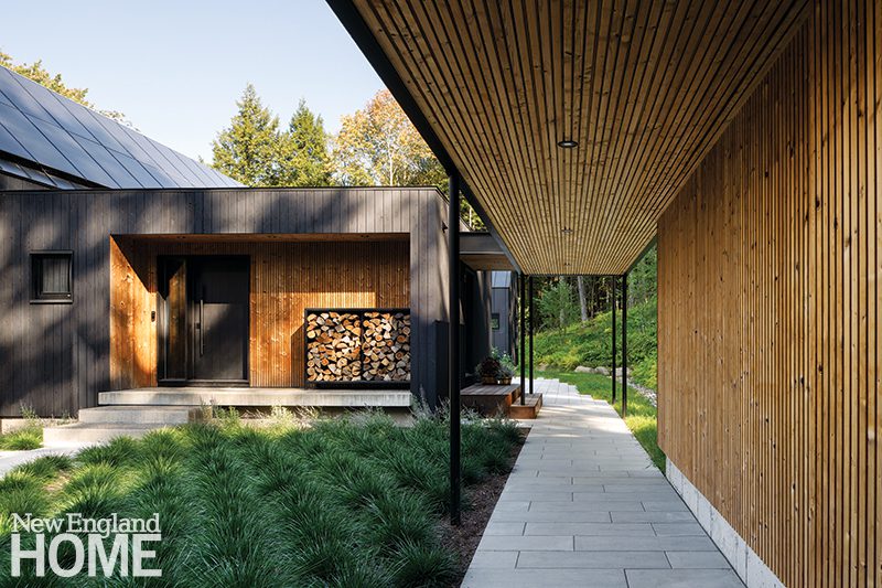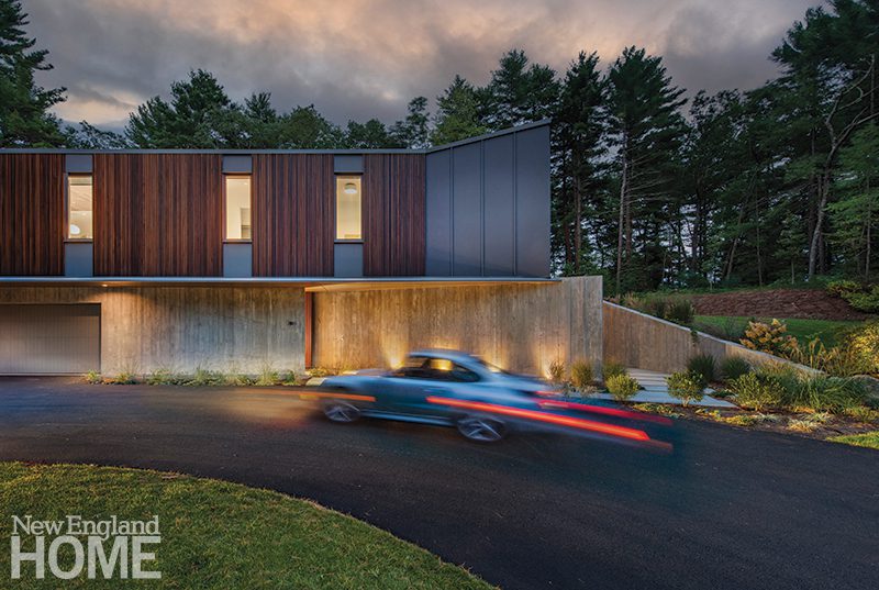 Working with the topography of the land, architect Colin Flavin burrowed the base of this Dover, Massachusetts, house into the hillside, keeping the front fairly solid to enhance the sense of discovery as visitors venture inside. A winglike canopy cantilevers over the entry, providing shelter from the elements. The floor above opens on grade with the backyard and is clad in mahogany slats and painted exterior-grade plywood.