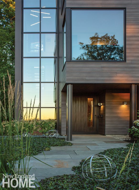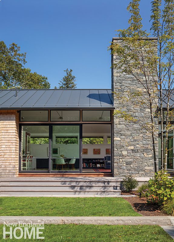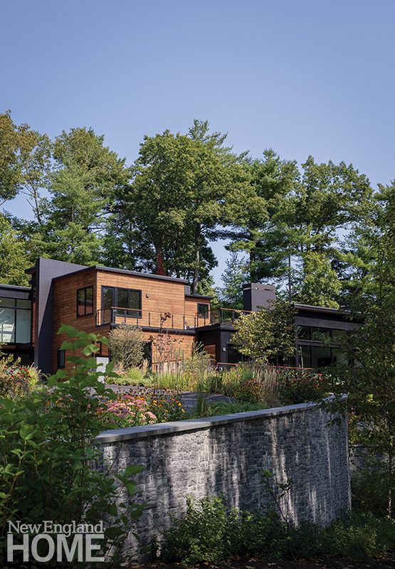 Landscape architect Abigail Adams used giant boulders uncovered during the excavation of the foundation to form a defining wall framing stone steps leading to the rear of the house. Meeting the low-maintenance mandate, architect Julia Metcalf used Hardie Plank Lap Siding, a cement product, for exterior cladding.