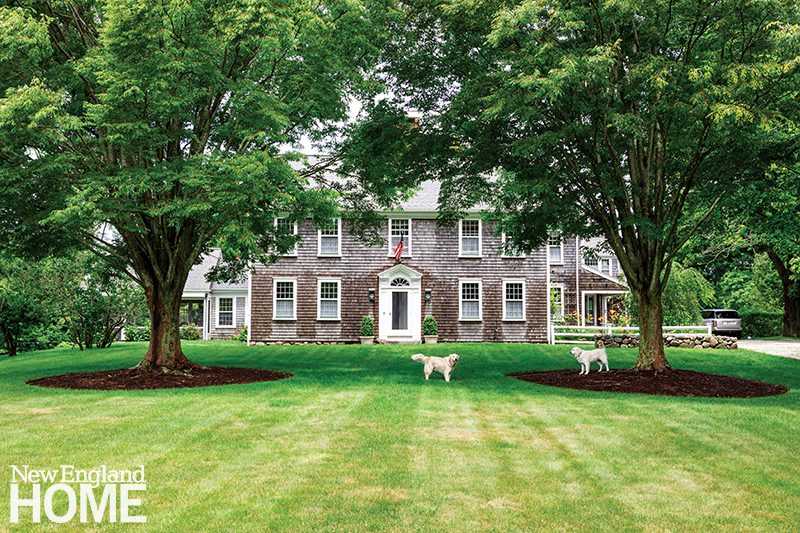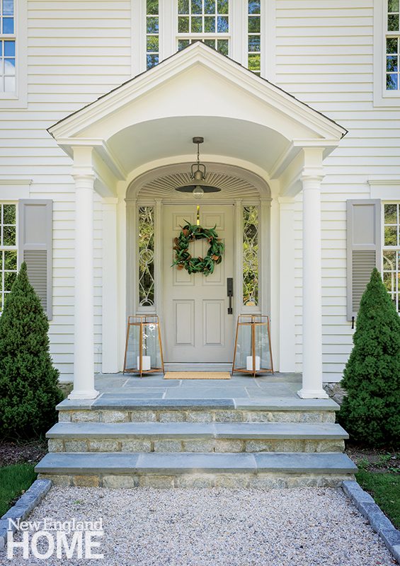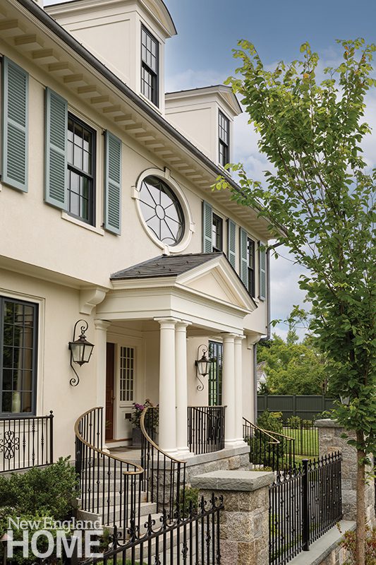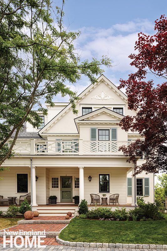 “It’s an exaggerated version of a traditional entry,” says architect John DaSilva of the fanciful entrance he designed for the new central section of this Lower Cape home. Tiny shuttered dormers crown the roof, which features a widow’s walk bracketed by chimneys and adorned with arches that echo throughout the home.
