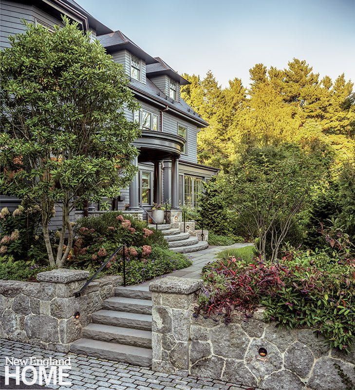 The entrance gates set on granite posts match the trim of the house and open to a peastone parking court and the guest cottage. Fragrant lavender spills over the bluestone-edged bed that lines the pathway to the front entrance. Drifts of Incrediball hydrangea and fountain grass soften the cottage courtyard.