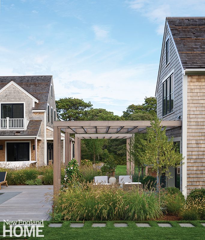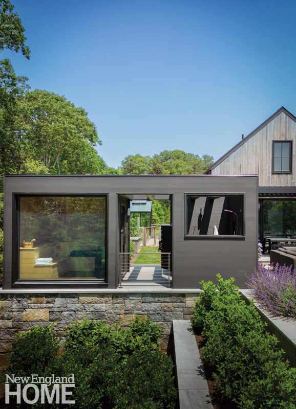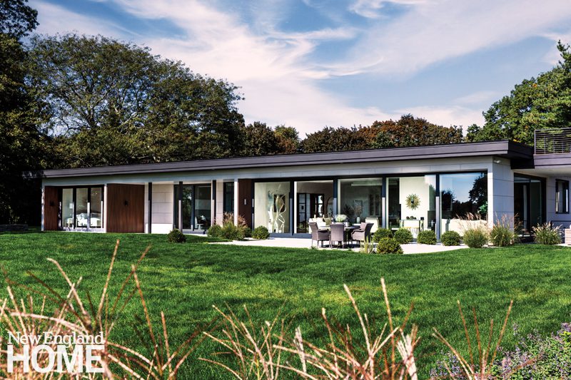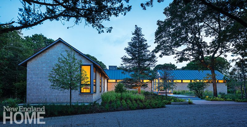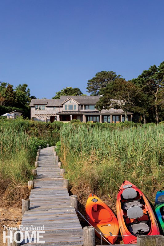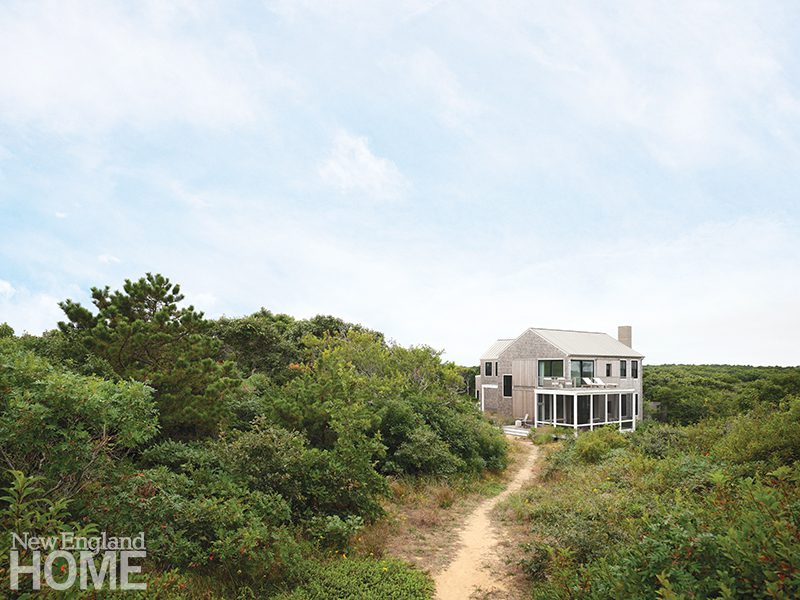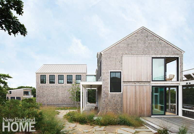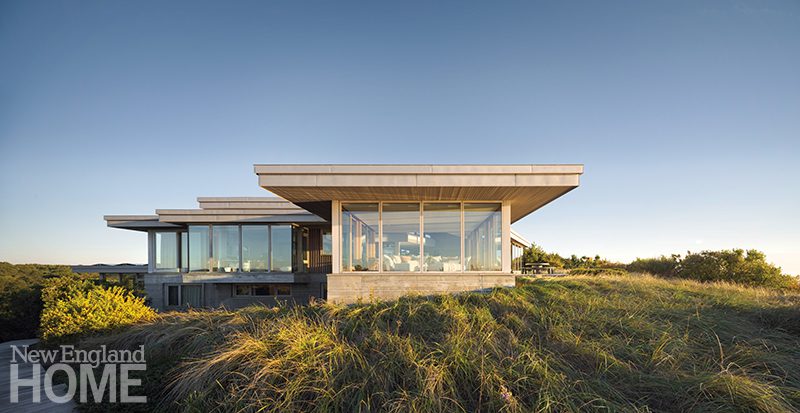 Set 100 feet above Cape Cod Bay, this 6,500-square-foot house hunkers into its setting, abetted by nearly three acres of naturalistic grounds designed by landscape architect Kris Horiuchi. “Wherever you are—in the house or on the decks—you always feel connected to the native coastal landscape,” she says.