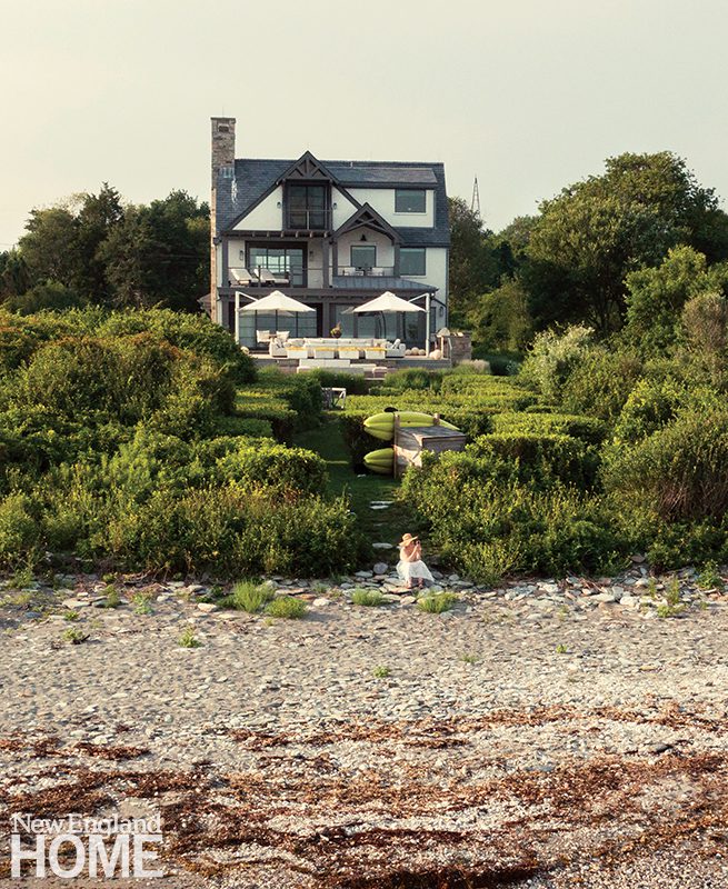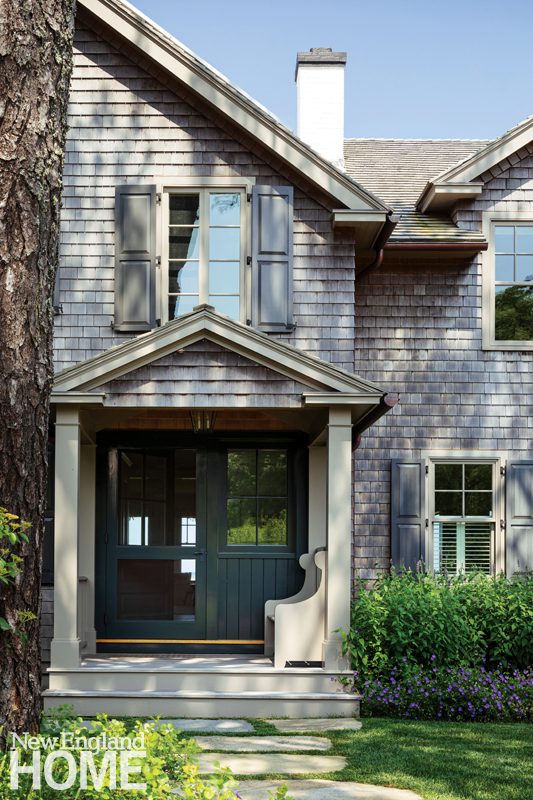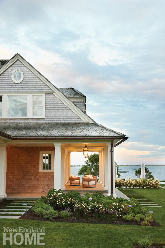 Nestled into the lush natural vegetation of its coastal location, “the home evokes time and tradition within its setting,” says interior designer Terri Ricci. Cedar shingles weathered silver-gray by sun and salt air reinforce the low-key vibe of a beach house, which sits at the end of a stepping-stone path.