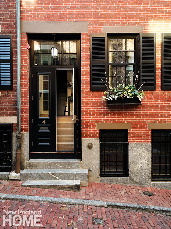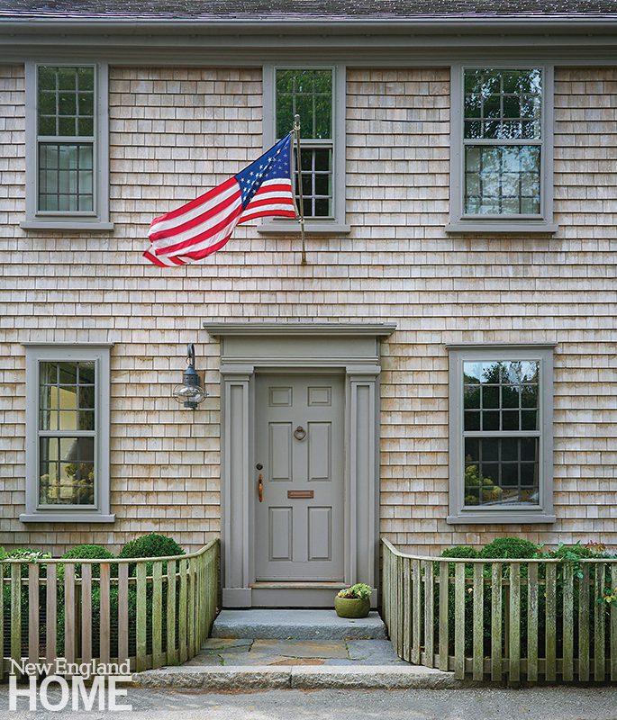 Gates played off the green patina of the aged copper roof over the front stoop by painting the shutters and the front door Sherwin-Williams Mountain Road green.